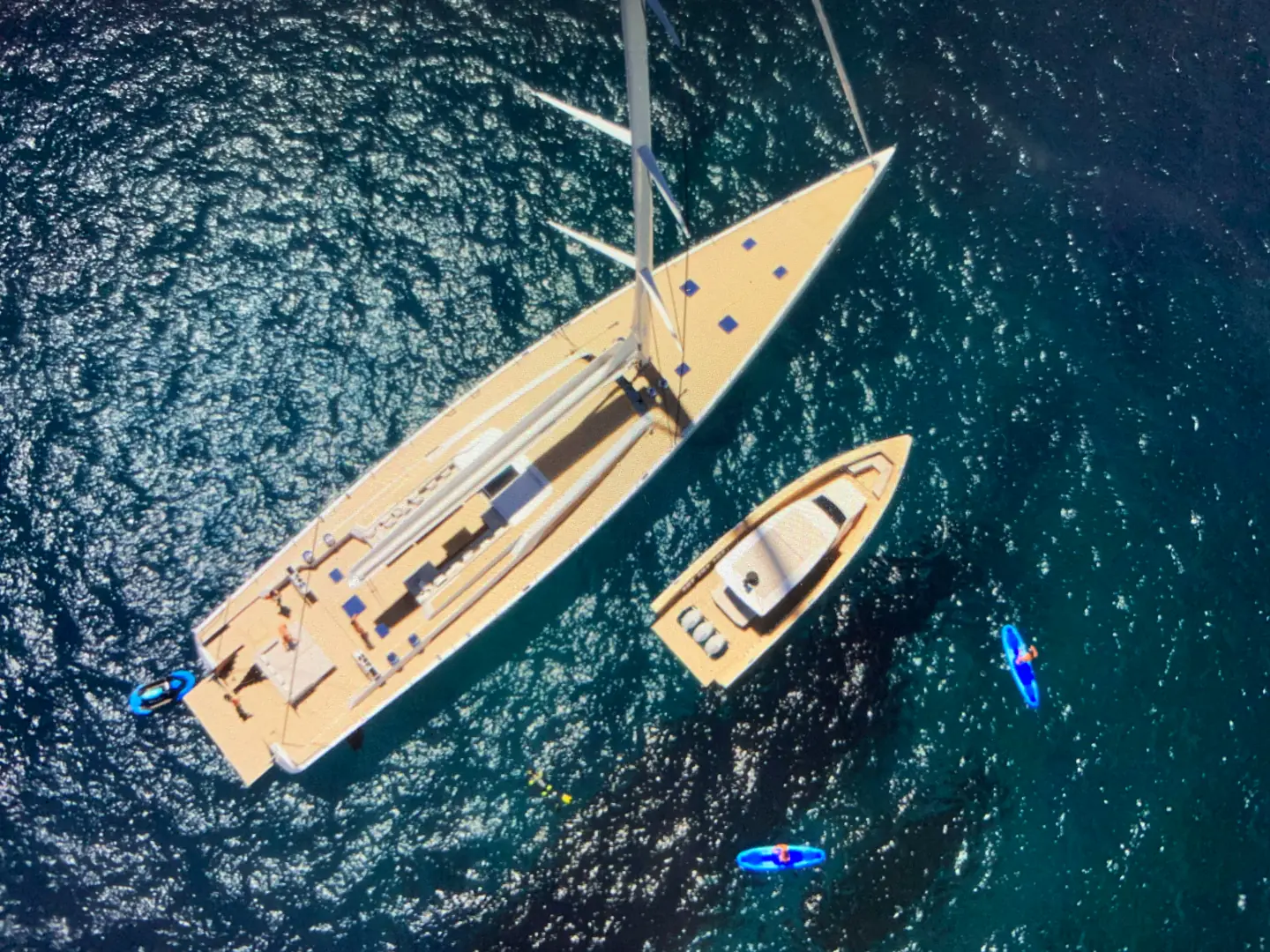 Jollegarasje, som de store seil-Swanene er kjent for, vil enkelte eiere ha en annen løsning istedenfor. Nå, kan du på f.eks 105-foteren, fra akterlugaren trekke store glassdører til side og gå rett ut på et «Beach-område». En liten dinghy er det plass til på fordekket.