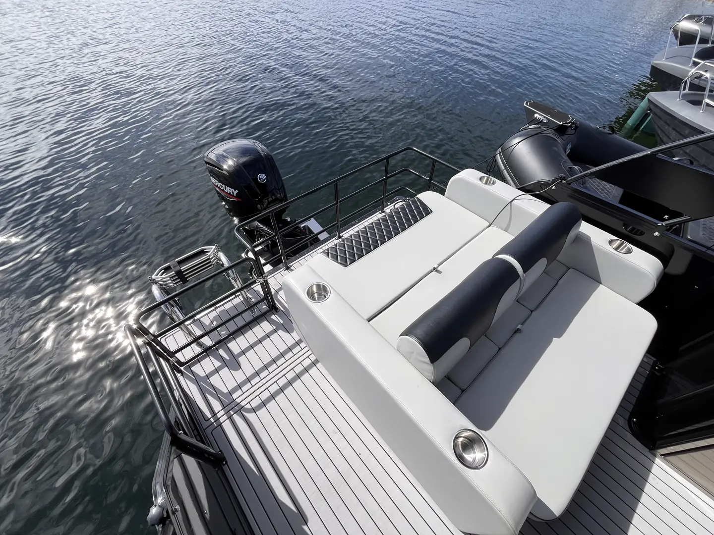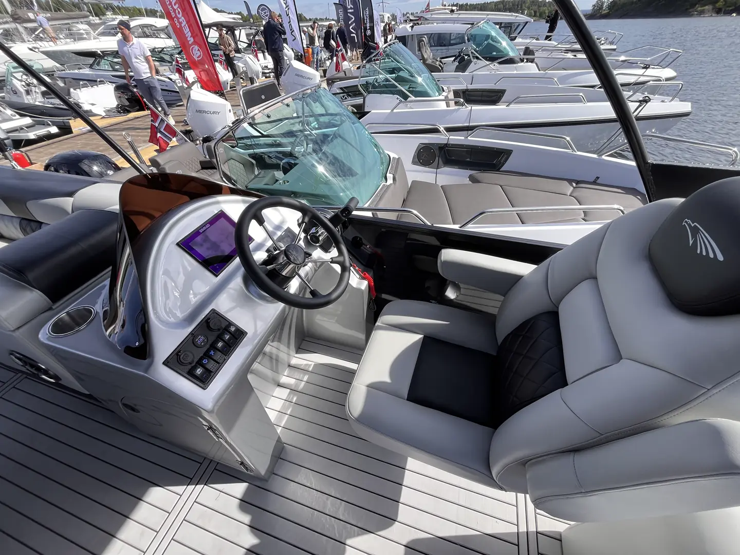 På hekken sitter største motoralternativ, en Mercury på 115 hk. med hydraulisk styring. Markus har akkurat rukket å få en prøvetur før messestart, men har ikke testet toppfarten ennå. Skroget består av tre pongtonger i aluminium.
