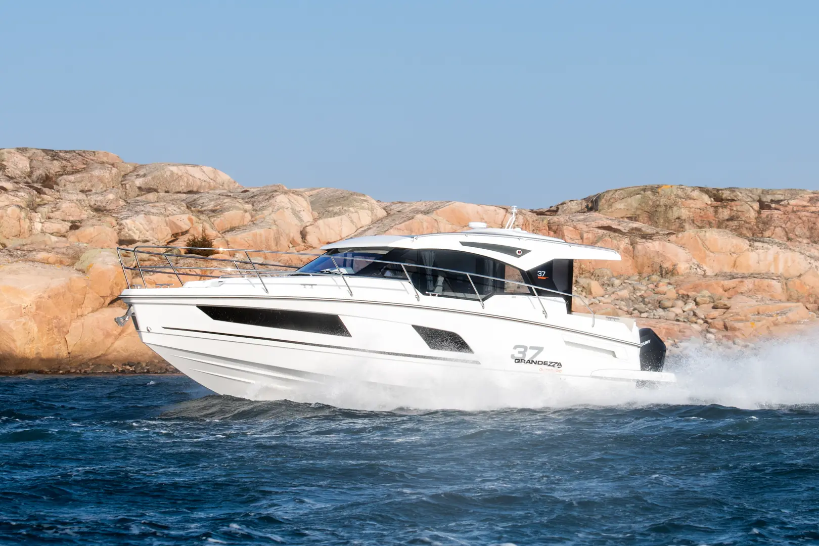 Grandezza 30 Outboard er 9,35 meter lang og har plass til ti personer og to lugarer med totalt fire køyeplasser. Denne utstyres med to Mercury Verado V8 på 250 hk.