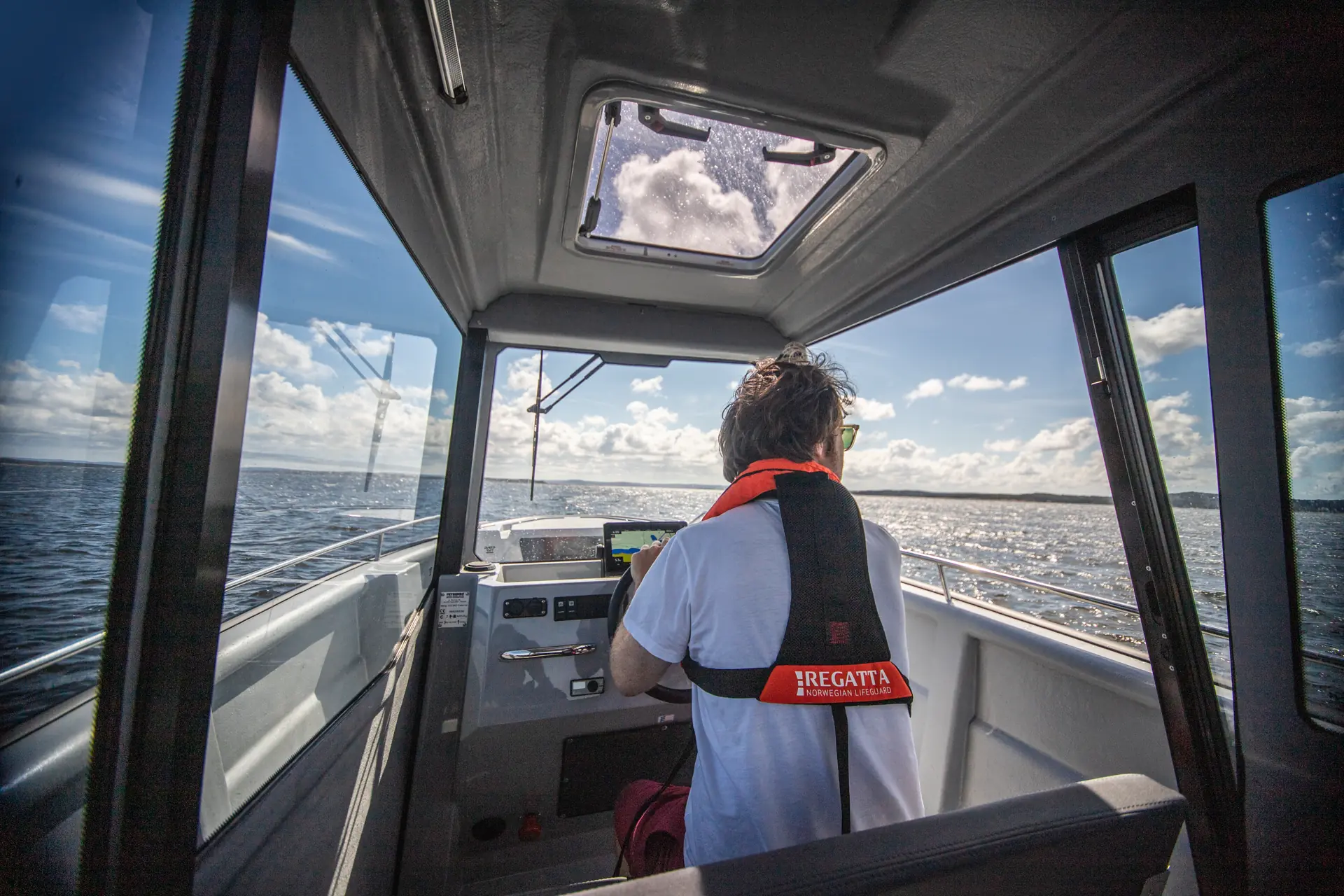 Vi ligger i 25 knop og kan fint snakke med innestemme – og ikke minst høre Norsk Pop med vår enkle reiseradio for øyeblikket. Vi glir mellom holmer og skjær på en nokså gufsete junidag. Skyvedøren går opp og igjen avhengig av temperatur, solforhold og ikke minst vinden. Det lukkede styrhuset kommer virkelig til sin rett på en dag som denne, selv midt på sommeren – og takket være store vinduer har vi panoramautsikt.