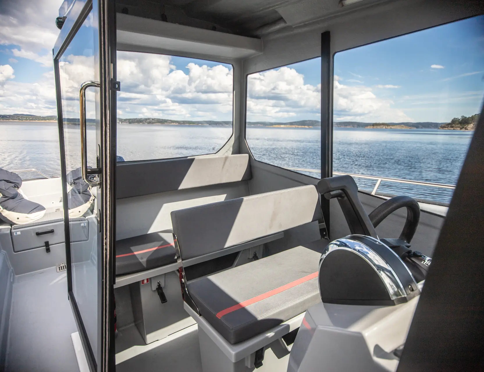 Å sitte i en lukket hytte setter ofte både skrog, støyisolering og sjøegenskaper på en ekstra prøve. Selv om selve kjørestillingen og ergonomien er enkel, men funksjonell, oppleves Sting sin styrhusbåt overraskende komfortabel i sjøen. Spesielt så enkelt den fremstår. Den går mykt uten overraskende slag, og lukker vi skyvedøren reduseres støynivået betraktelig.