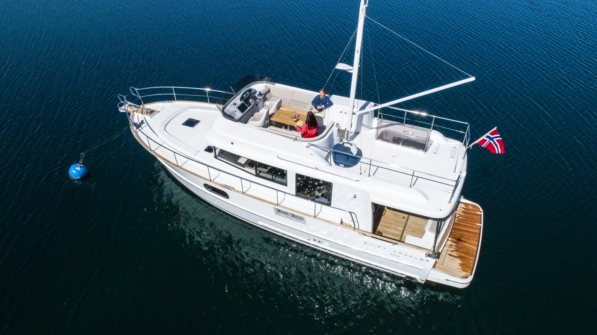 At uteplassen på denne modellen er blitt større – og med sikkerhet kan konkurrere i toppen blant 44-fotere, er det liten tvil om. Akterdekket har fast L-sofa for tre personer og kan utstyres med bord og ekstra stoler. Her er det også mulig å få kalesje, og med døren ut til sidedekket på styrbord side, er adkomsten enkel.