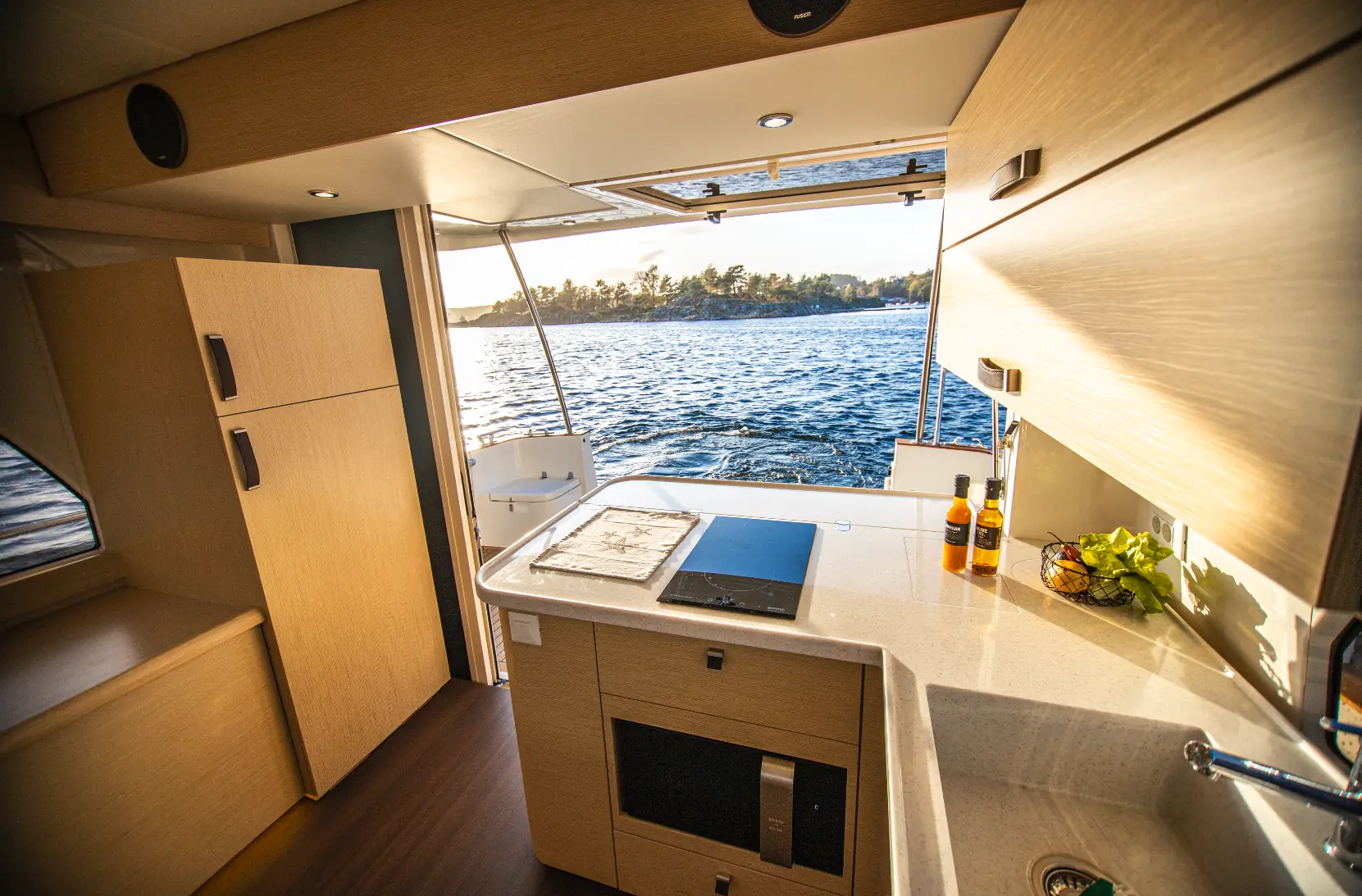 Etter noen uker om bord er det spesielt noen detaljer vi biter oss ekstra fast i. Dette er først og fremst de store vinduene i salongen, sammen med glassveggen og skyvedøren akter. Dette gir panoramautsikt for både fører og passasjerer – selv om sikten er noe begrenset forover fra salongen. Nærmest hele bakveggen kan også åpnes slik at byssa og salongen blir en del av akterdekket. Sammen med en elektrisk takluke som betjenes fra førerposisjonen, samt skyvedør på styrbord side, blir båten åpen og luftig for sommerlige dager.