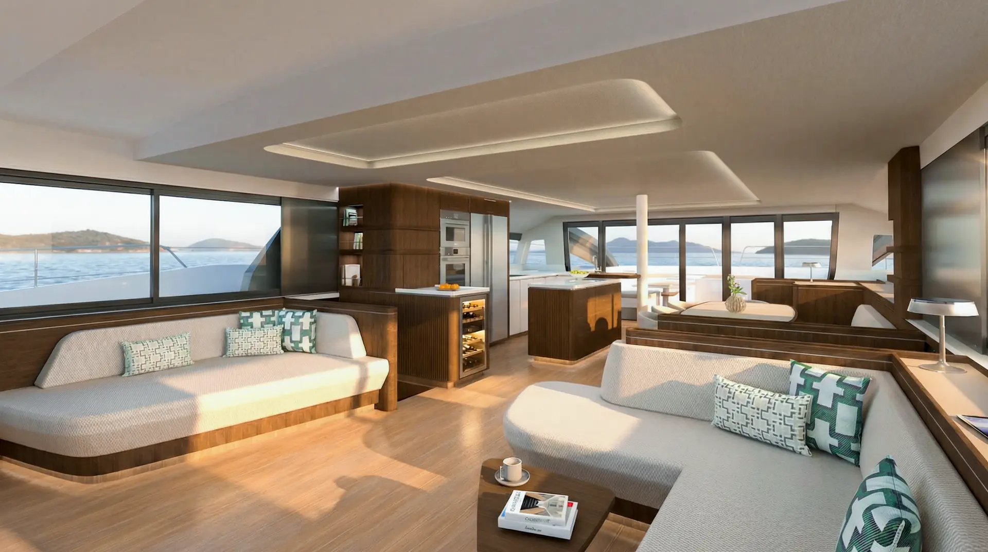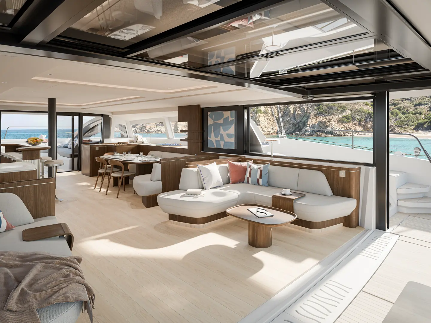 På Bali 7.0 videreføres denne løsningen, samtidig som planløsningen er utvidet fremover i båten. En bred åpning kobler salongen direkte til fordekket, noe som gir en mer sammenhengende flyt fra akter til baug.