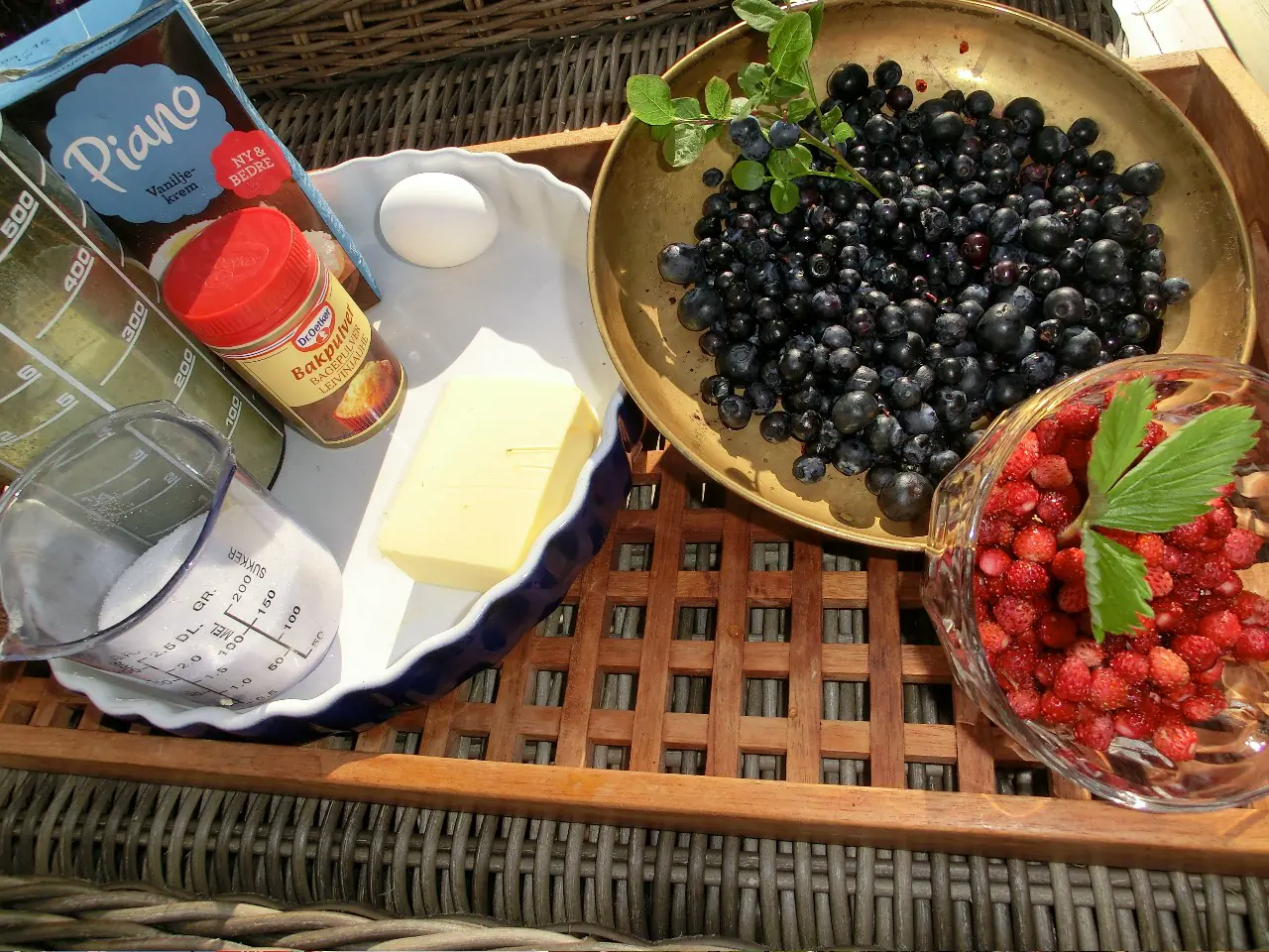 Fordel bærene på toppen. Bre toppingen eller vaniljekremen over bærene. Stek på 200 grader i 30min. Beregn tid til avkjøling før dere kaster dere over den.