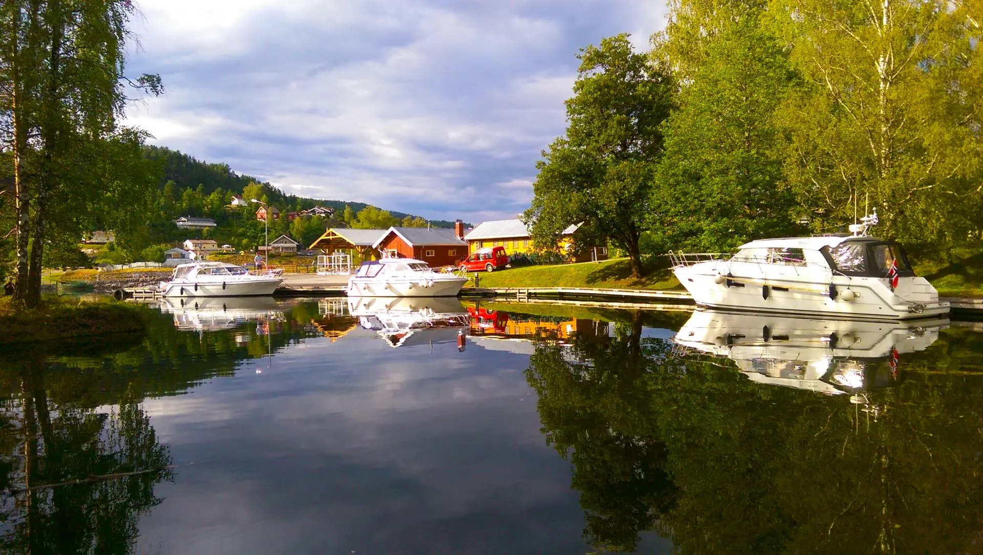 Så var det å rusle i fem knops fart oppover fra Skien by og opp til neste sluse Løveid. Det er en tur på omtrent tretti minutter. Her var det rett inn og slusing med en gang. Her er det tre kammer og førti minutter senere var vi oppe. I felleskap besluttet vi at vi ønsket å ligge et sted med butikker tilgjengelig for natten, så kursen ble satt over den store innsjøen Norsjø og mot Ulefoss gjestebrygge, en tur på 1,5 time. Her hadde man alt man kunne ønske - landstrøm, vann, toaletter, dusjer, søppeltømming, septik, drivstoff (riktignok dyrt) og en kiosk/gatekjøkken. Sentrum med butikker var ti minutters gange unna. Litt trafikkstøy fra veien rett ved, men det fikk man tåle.