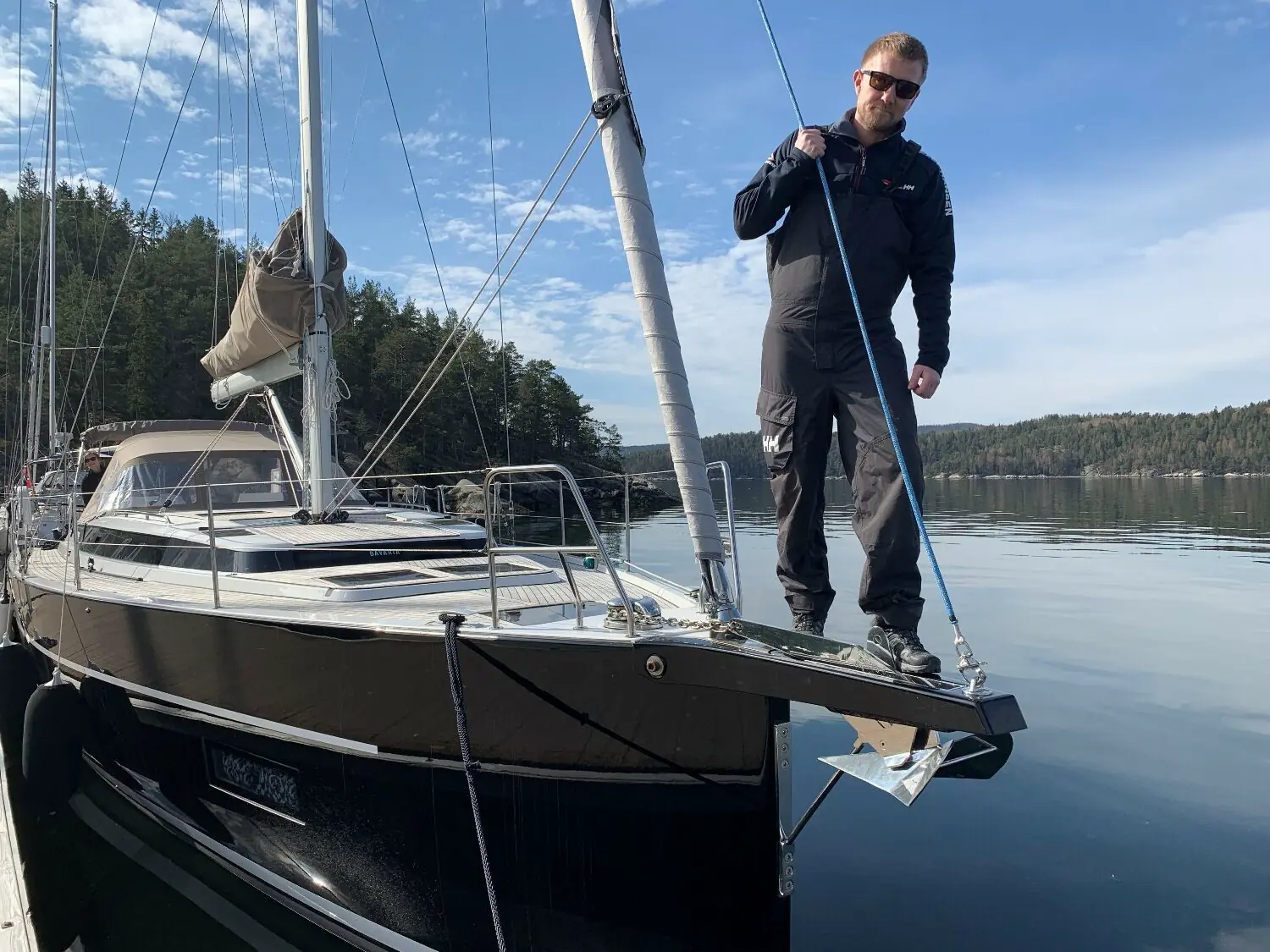 Det er midt i Påsken, nydelig vær, men minusgrader om natten. Vi ligger i en naturhavn i indre Oslofjord. Ikke alene, med så sen påske, har mange flere enn vanlig søkt seg ut med båten. Neste morgen kommer en helt svart Bavaria 45 glidende og legger seg til. Svart? Denne Bavaria-kombinasjonen trodde jeg ikke fantes. Dette må undersøkes.