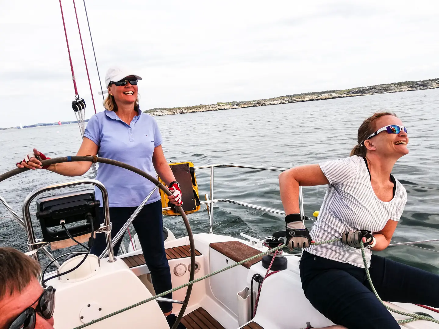 – Jentene jeg har med om bord er flinke. Jeg står ikke selv til rors, men det er likevel naturlig at jeg er skipper, siden det er jeg og mannen min som eier båten. Flere av jentene er langt mer drevne seilere enn meg, men som skipper er det jeg som tar de endelige avgjørelsene. Gir jeg beskjed om at vi skal bytte seil er det ikke rom for diskusjon, sier Grethe, som opprinnelig er byjente fra Vålerenga i Oslo. Da hun traff Nøtterøy-mannen Ove for over 20 år siden, bosatte hun seg i hans hjemtrakter, der de nå er svært aktive i Tønsberg Seilforening.