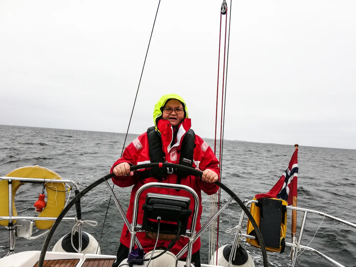 – Det var i 2017, og vi seilte ren jentebåt. Det kom noen skikkelige regn- og tordenbyger, og det var vindstille. Mens vi lå helt stille i Drøbaksundet var det en av jentene som ikke oppfattet at bomopphavet til spinnakerbommen ikke var festet. Hun skulle heise opp spinnakeren, men sjakkelen var løs, og hun dro spinnakeren helt opp i masta. Da får man den jo ikke ned igjen uten at noen må klatre opp i masten for å få den ned. Heldigvis hadde vi med oss seilmakerstolen og et løst spinnakerskjøte. Vi festet seilmakerstolen i det andre spinnakerskjøtet, og fikk en av jentene opp i toppen, mens vi var omringet av øsende regnvær, lyn og torden, forteller Grethe. Det kom ikke rent lite vann fra himmelen den dagen, for da Grethe snakket med mannen, som var hjemme på Nøtterøy, på telefon fortalte han at gata var omgjort til en elv.
