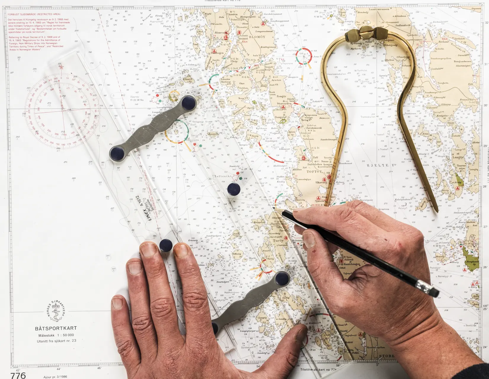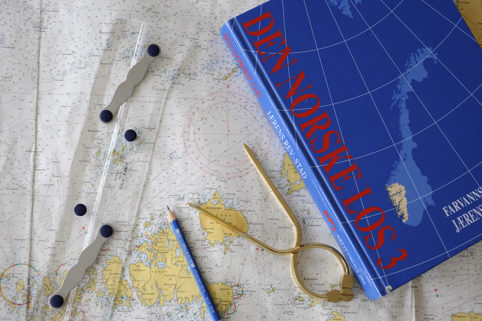 Foruten aktuelle sjøkart må du selvfølgelig ha kompass om bord – noe de aller fleste har. Pass på at kompasset er riktig montert og at det ikke er noe som påvirker det. I tillegg trenger du en parallellforskyver eller kurslinjal, en passer og blyant. Disse brukes til å sette av kurser og til å beregne distanser.