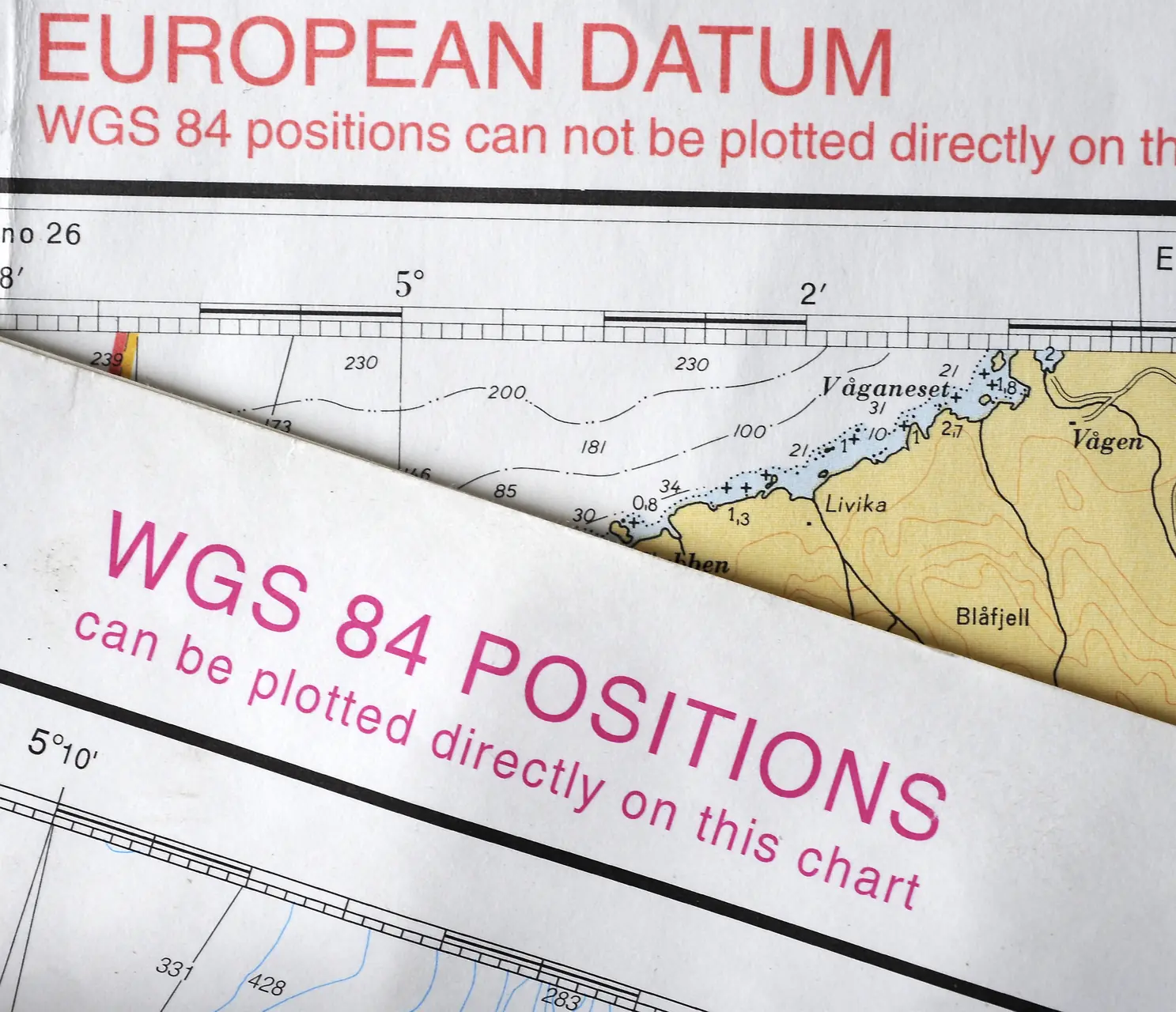 World Geodetic System (WGS-84), som avløste ED-50, er et verdensomspennende internasjonalt geodetisk referansesystem som er svært presist. Posisjoner fra GPS-baserte systemer kan plottes ut direkte i kartene med gradenett i WGS-84. Alle dagens sjøkart er WGS-84. Legg merke til at sjøkartene oppe er merket med rødt om du kan sette av GPS-posisjon direkte.