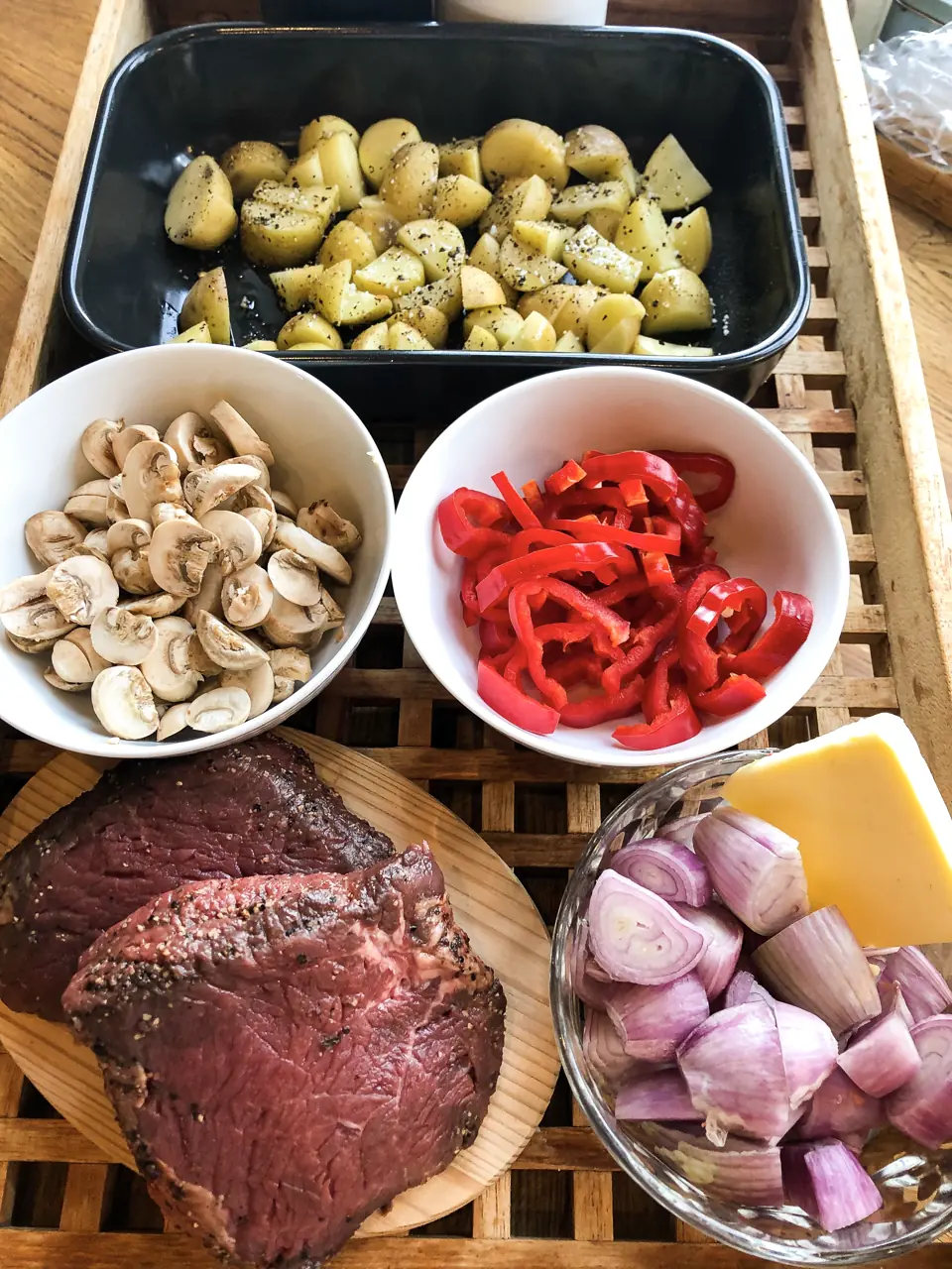 Har du tilgang på stekeovn om bord, begynner du med å dele opp potetene og legge dem i en ildfast form med litt olivenolje, salt og pepper. Sett ovnen på 200 grader og beregn 30 min eller avhengig av størrelsen på potetene.