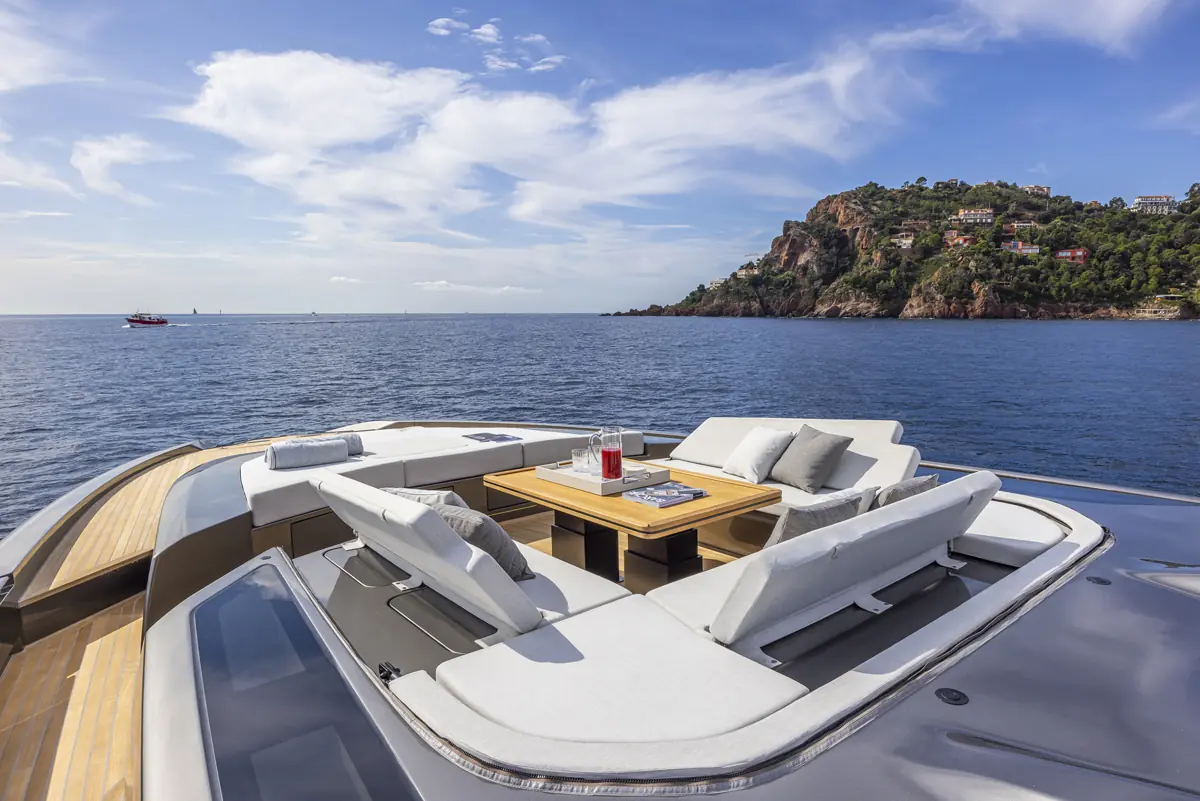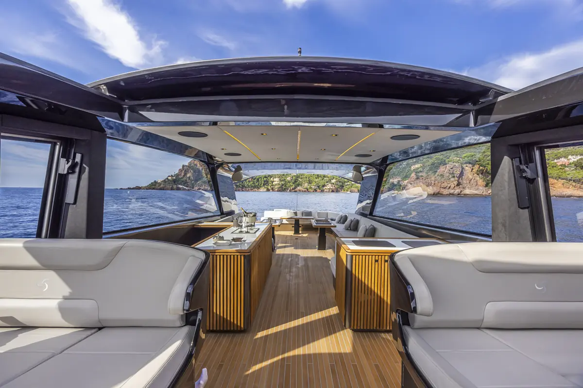 “Vi konsentrerte oss,” forklarer Belardinelli, “om en grundig analyse av vektfordelingen og ingeniørarbeidet av hardtoppen. De store sidevinduene og den enorme frontruten skaper en utrolig romfølelse ombord, sammen med en innvendig høyde på over 2,20 meter. Designet gir perfekt sikt og lar naturlig lys strømme inn i båten