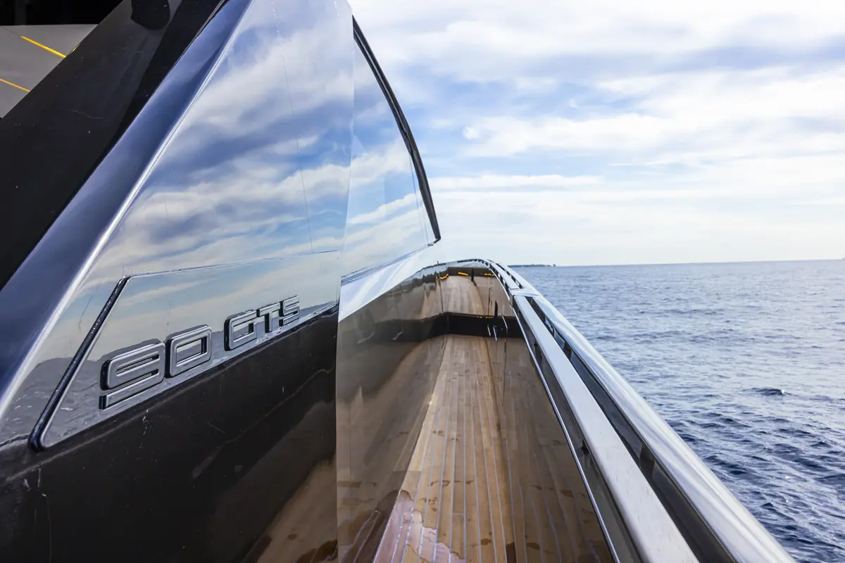 Like oppsiktsvekkende er yachtens stillhet i alle hastigheter. Dette har verftet sørget for gjennom nøye strømningsstudier som å eliminerte all turbulens. Til tross for at GTS er en semi-åpen versjon, forblir komforten ombord imponerende, selv i høy hastighet og i grov sjø.