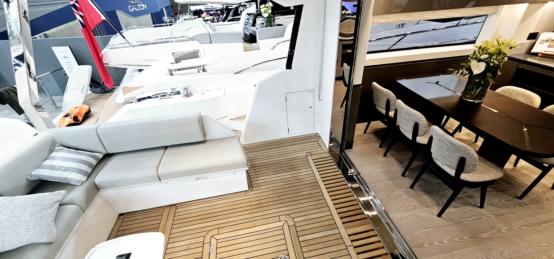 Vi starter med å gå fra badeplattformen og opp på akterdekket. Her finner vi en komfortabel L sittegruppe, med god plass på begge sider. Her kan du komme fra badeplattformen og opp fra både styrbord og babord side.
