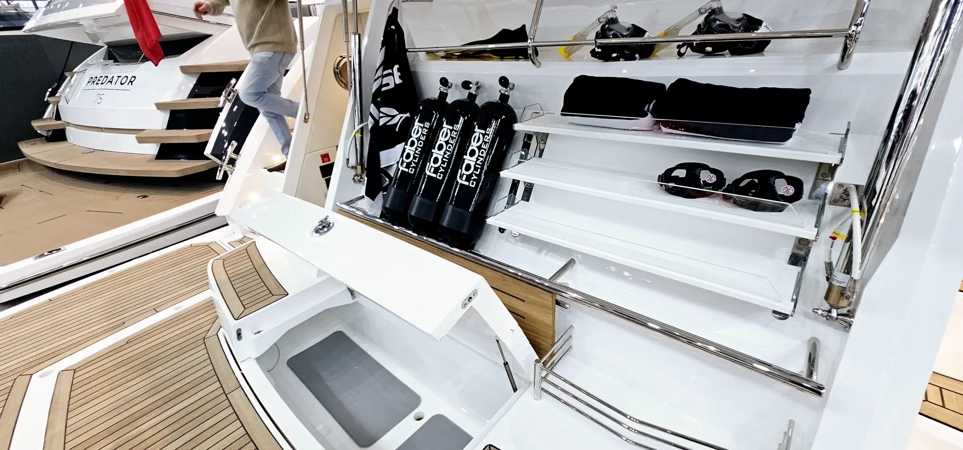 På badeplattformen er det smart system for alt av vannaktiviteter man ønsker å bedrive, også dør ned til mannskapslugaren.