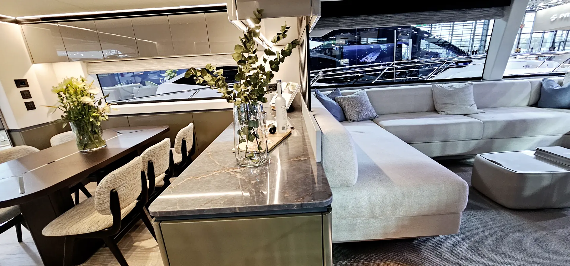 Videre inn møter vi en stor spisegruppe med løse stoler, som man bare finner på de store yachtene. Pantry er også helt akter og inneholder vinskap og oppvaskemaskin. Marmordisk, store kjøleskap og fryseskuffer, alt lagt til rette for å diske opp de beste måltid til gjestene ombord.