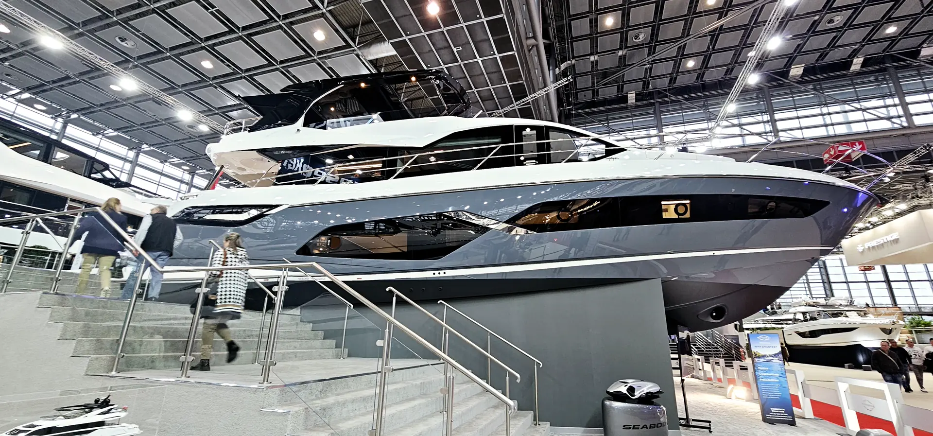 Vi går ombord der den ligger som en stjerne i utstillingen til Sunseeker. Lekker design og gråfarget skrog gjør den i øyenfallende.
