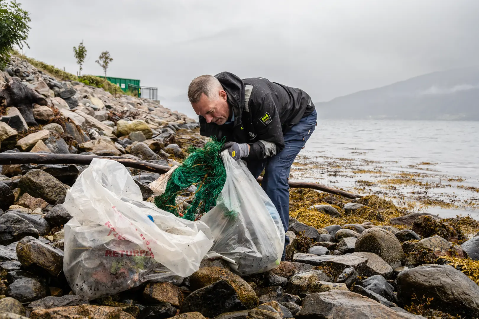 Med bøyd rygg og ryddehansker, ikke langt unna Chris, rydder også Frank Bakke Jensen, fiskeridirektør og øverste leder i Fiskeridirektoratet. Han har allerede fylt en stor plastsekk med søppel.
