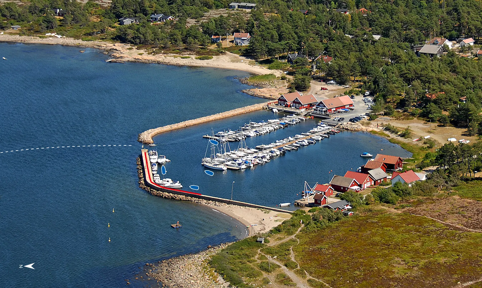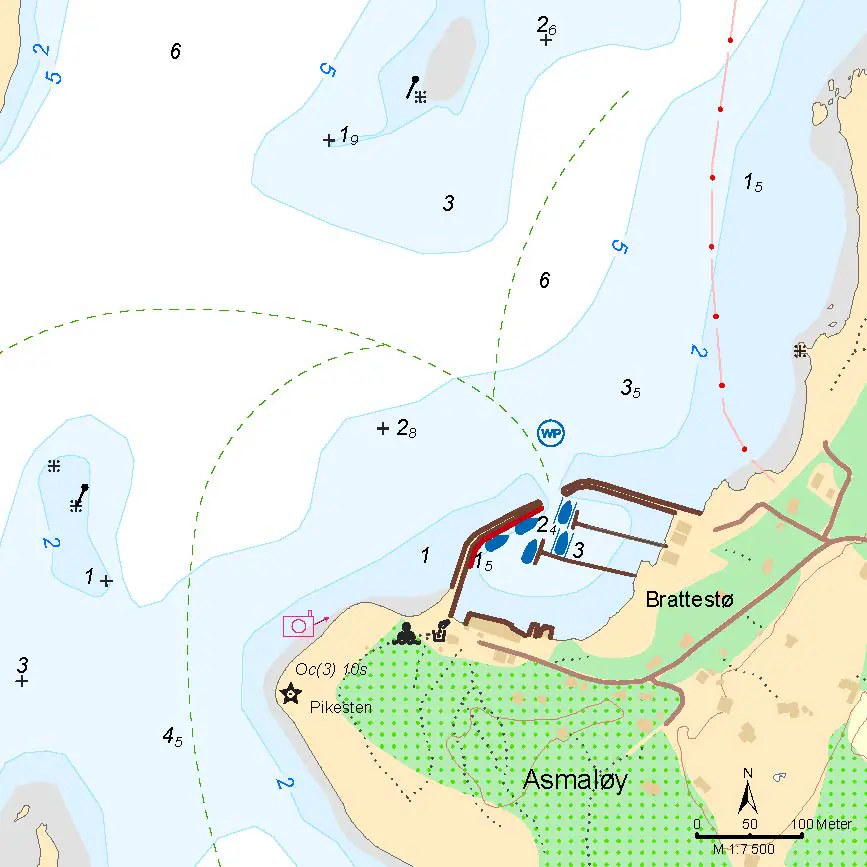 Ønsker du å ligge på svai kan du prøve utenfor moloen, men da er du avhengig av rolige vindforhold. Du ligger godt i le for alle vinder inne i havna. Innseilingen fra vest kan være krevende, fordi farvannet vest for Brattestø er urent. Den enkleste inseilingen er å gå inn fra sørvest mellom Pikesten og holmen vestenfor. Dybden i moloinnløpet er 3,8 meter.