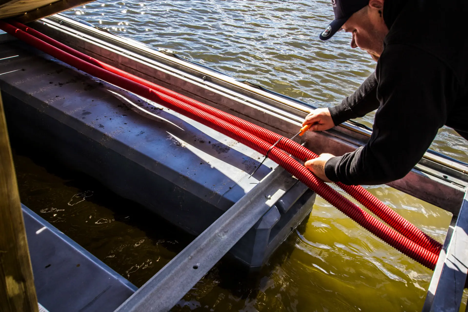Vi bruker derfor en meget sterk og slitesterk gummi-/purkabel som faktisk også tåler å ligge direkte i sjøvann. Siden vi kun skal montere to søyler på vår brygge kan vi gå direkte fra sikringsskap og seriekoble søylene. Til dette bruker Installatøren pur-kabelen som er cirka 2-3 ganger dyrere enn den rimeligere varianten PFXP.