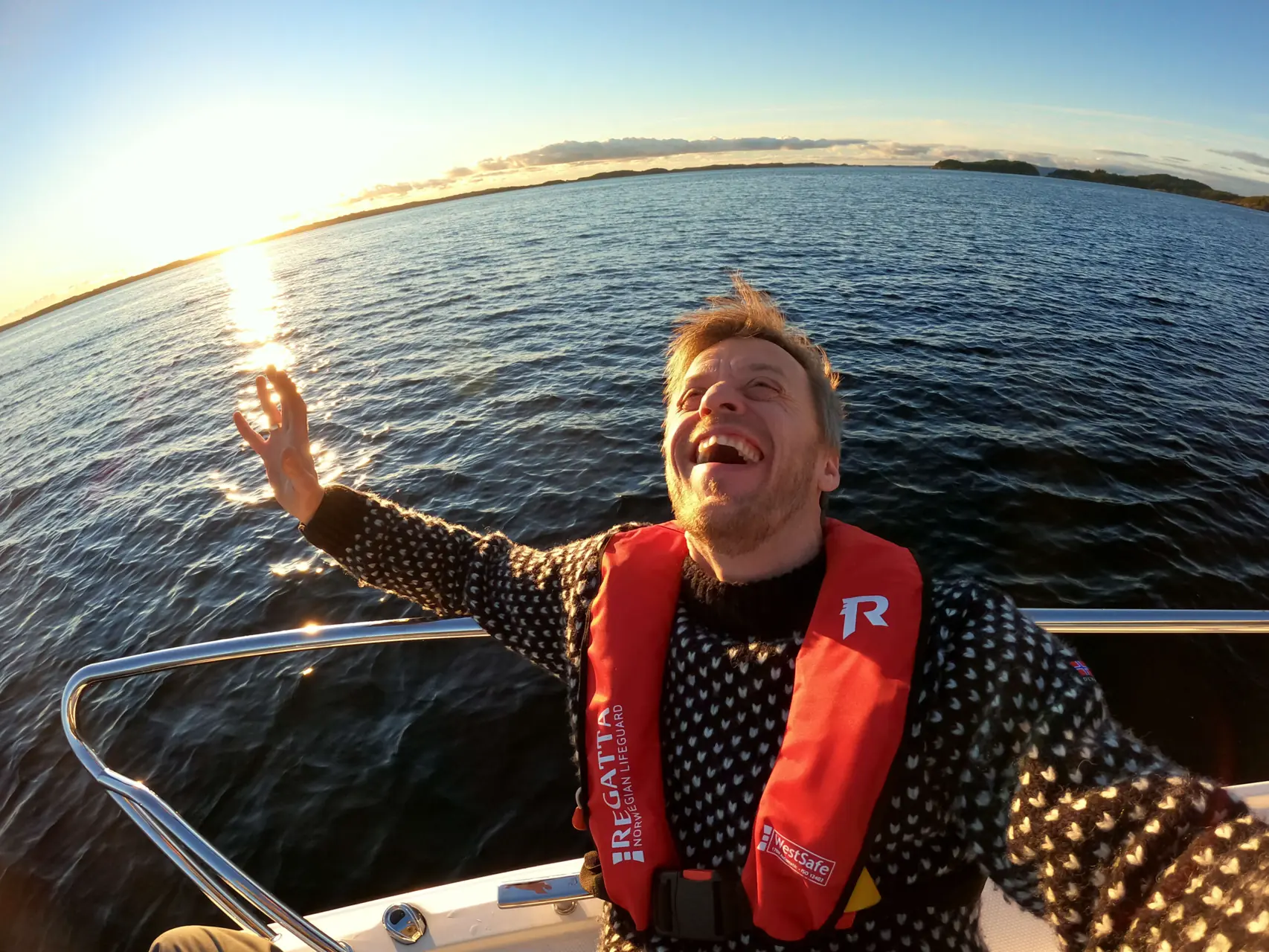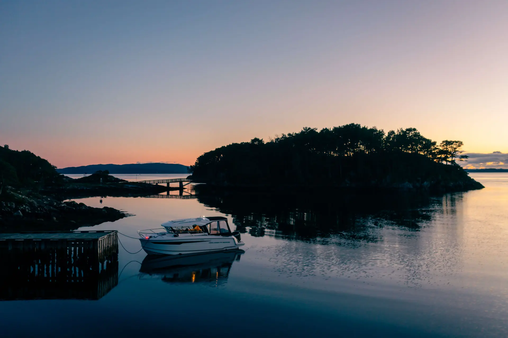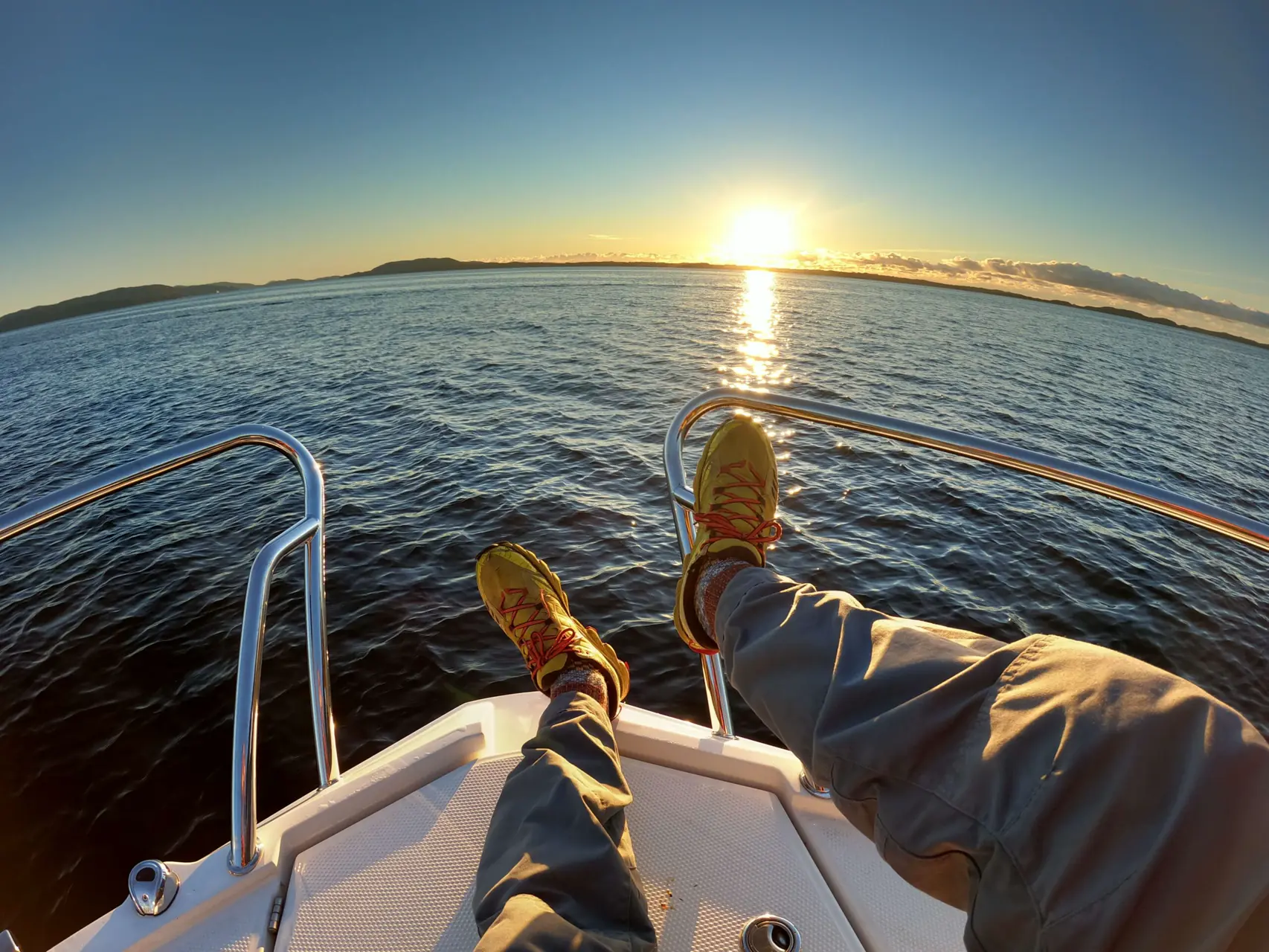 Klokken viser 17.03 og det er allerede bekmørkt. Båten vugger rolig i den rolige viken. Jeg ser fire hodelykter dukke opp borte ved stranden og hører noen ivrige barnestemmer og trygge voksne. De tenner et bål og setter seg rundt det, slik mennesker har gjort i tusenvis av år. Nettopp å stirre inn i bålet er det som er naturlig for oss mennesker, ikke skjermen. Jeg hører latter og småprat. Det får meg til å tenke på familien min hjemme. Hva gjør de nå? Har guttene fått gjort leksene sine? Jeg kjenner at jeg savner de litt allerede, men jeg har jo dratt hit for en grunn. Være alene. Være i naturen. Så jeg kler på meg en tykk ullgenser, tenner hodelykten og går en kveldstur. De første stjerne har allerede tittet frem. Kjeglen fra lommelykten lyser opp turstien, rundt er det tett med trær. Noen måker letter fra sjøen, ellers er det stille. Jeg stopper opp etter en stund, ser utover sjøen.