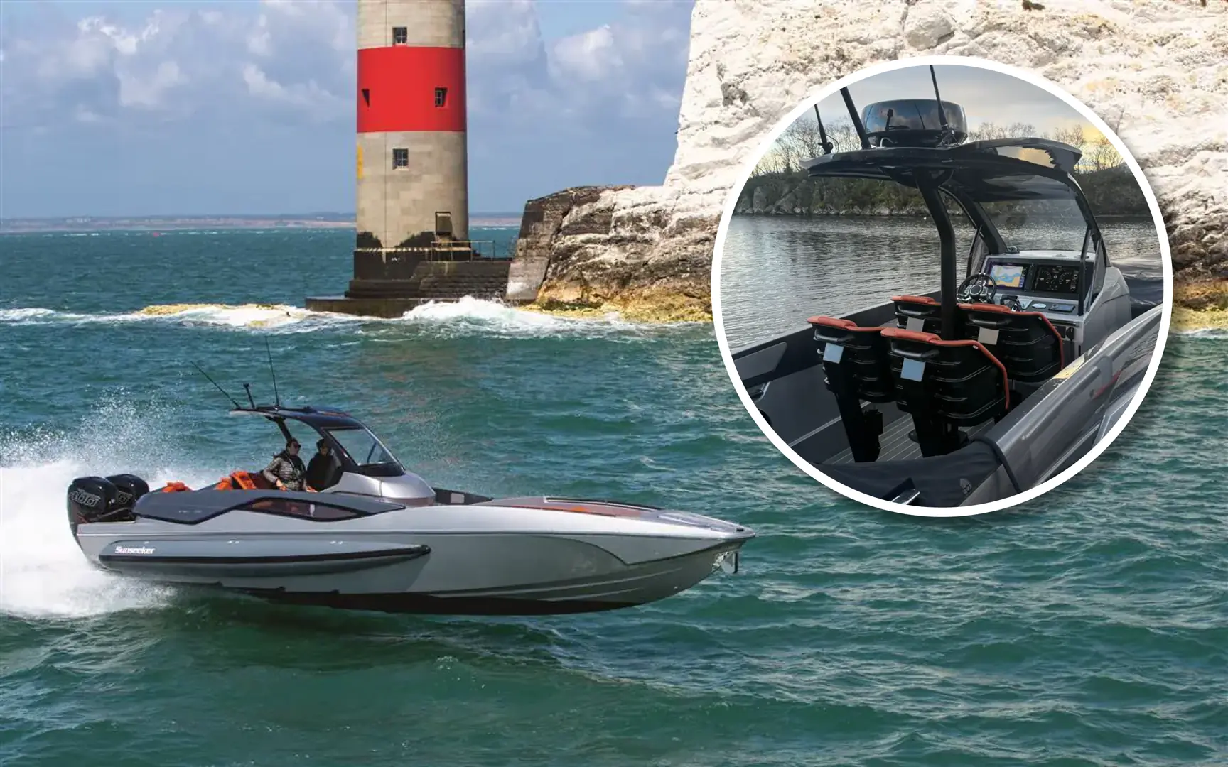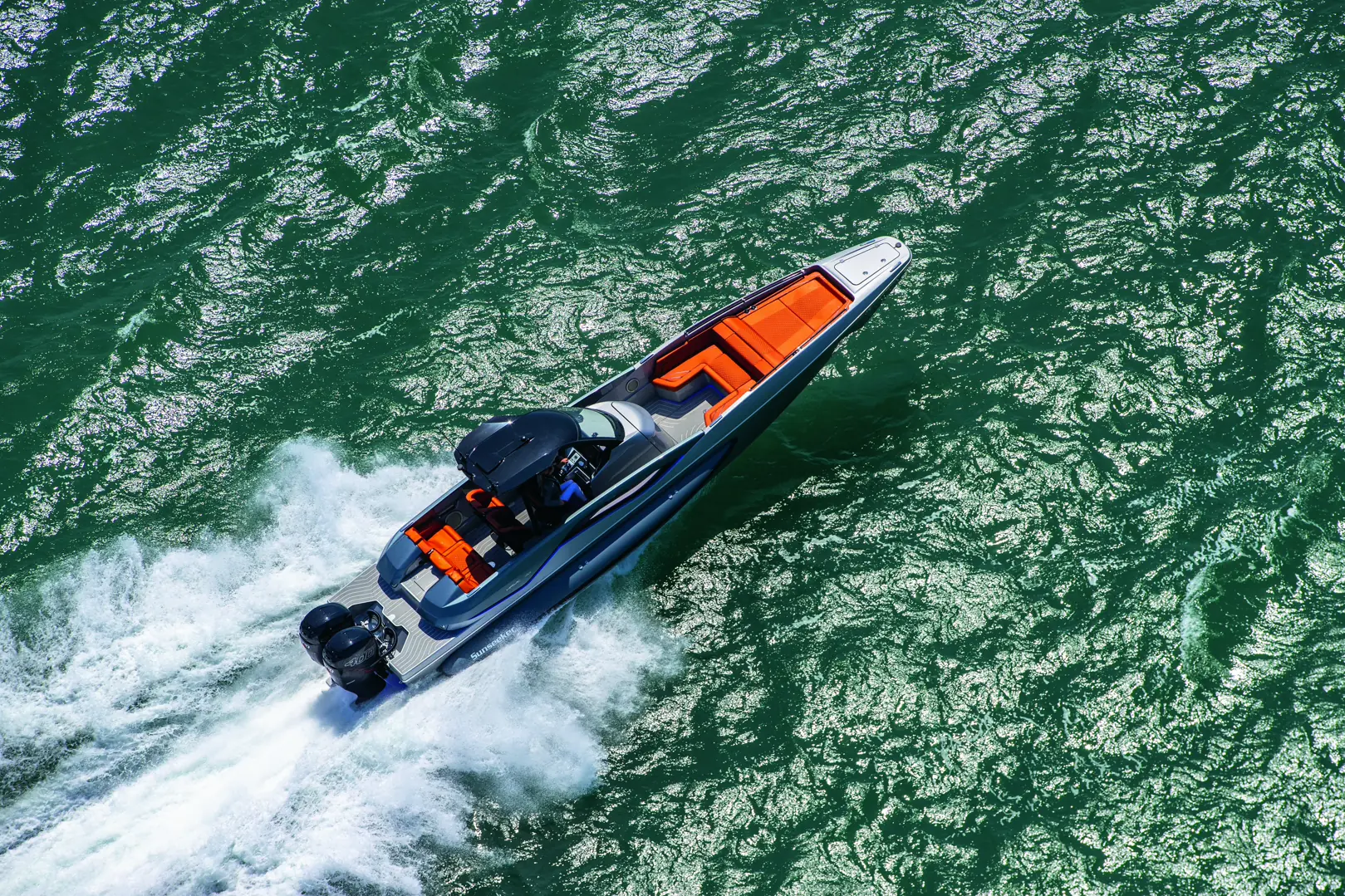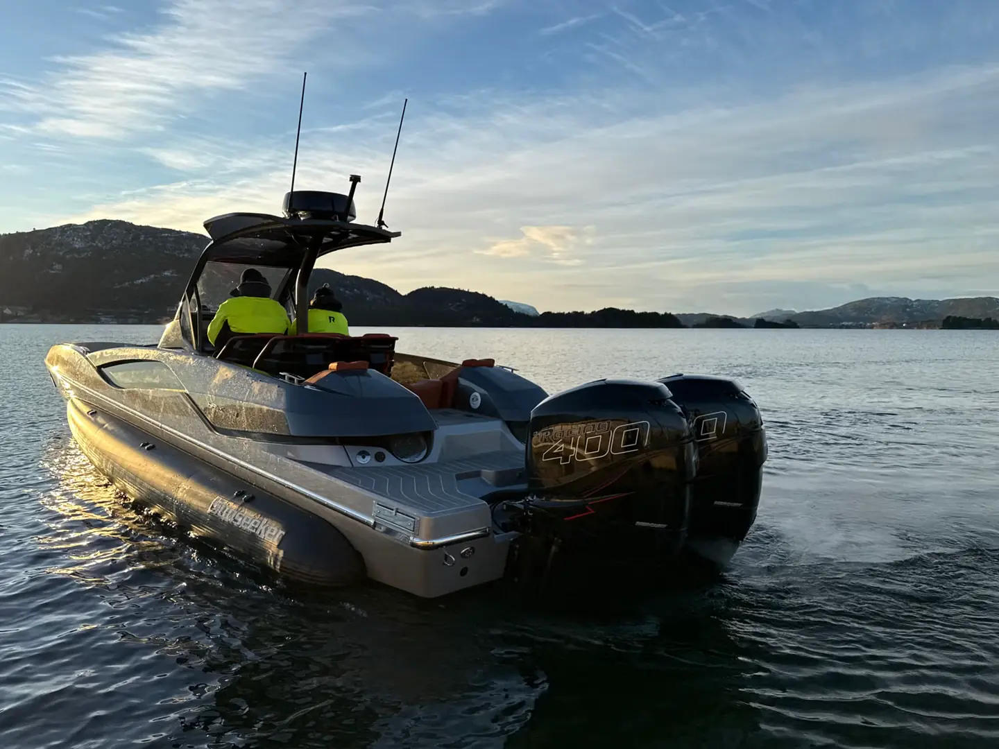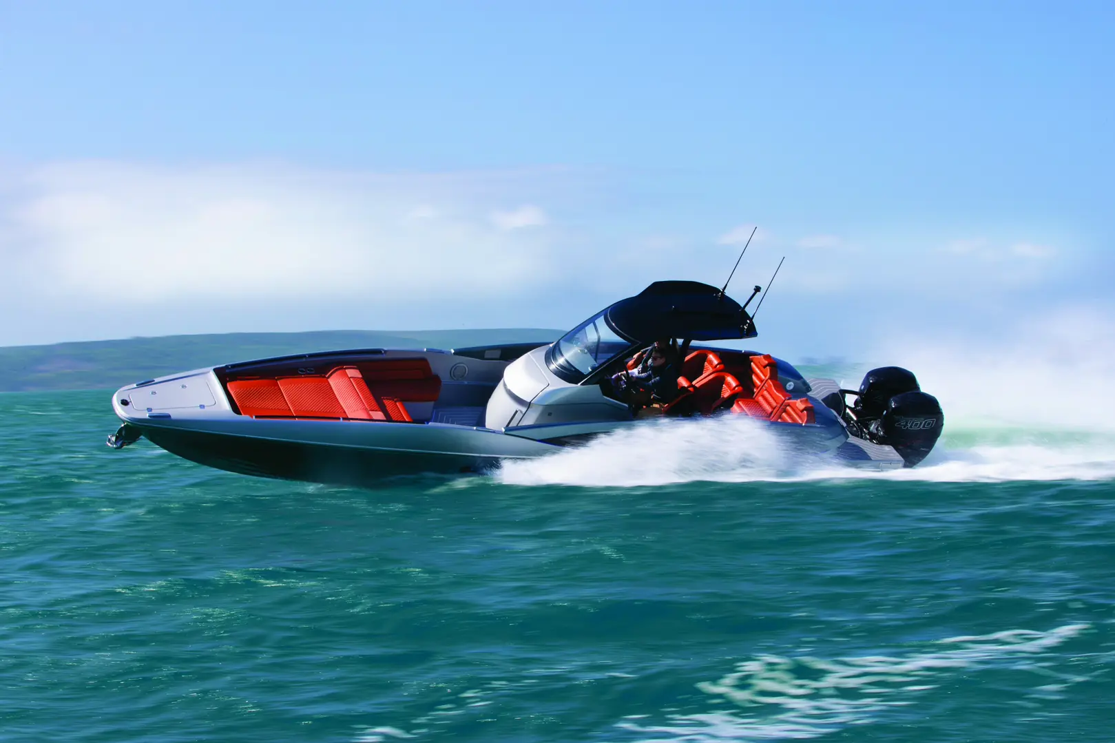 Med to Mercury 400R-motorer oppgis toppfarten til litt over 60 knop.