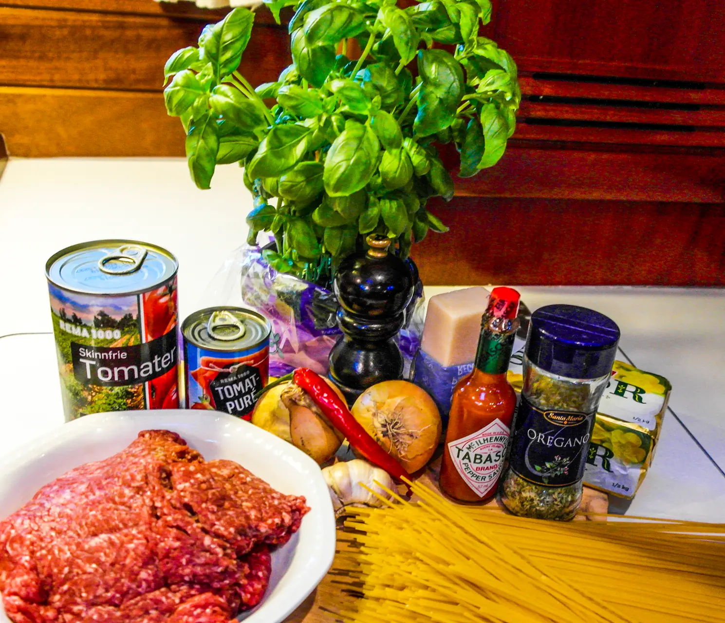 Nå smaker du til med oregano, tabasco, salt og pepper. Jeg bruker rikelig med oregano, men det er jo en smakssak. Jeg tilsetter gjerne litt sukker for å runde av smaken på tomatpuréen som ofte kan være litt skarp.