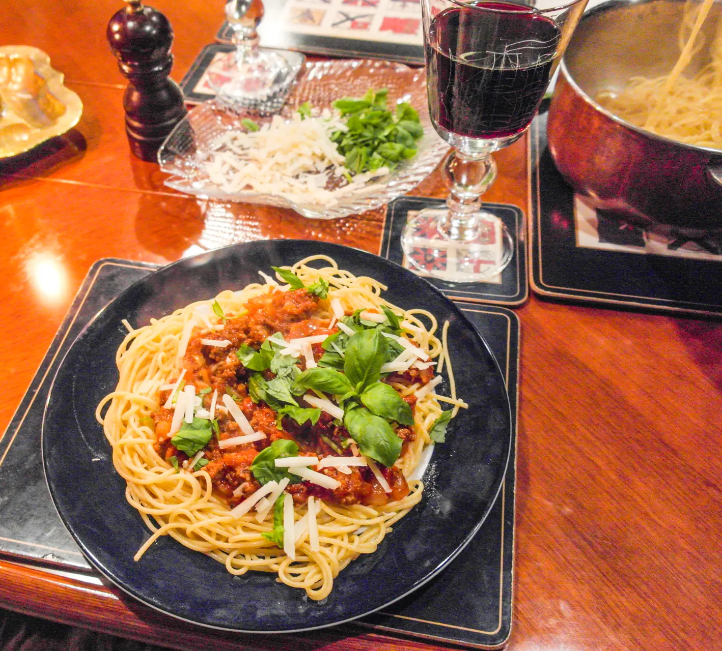 En pastasleiv er et praktisk redskap til å øse opp spaghettien. Fordel kjøttsausen over og topp med nyrevet parmesan og friske basilikumblader.