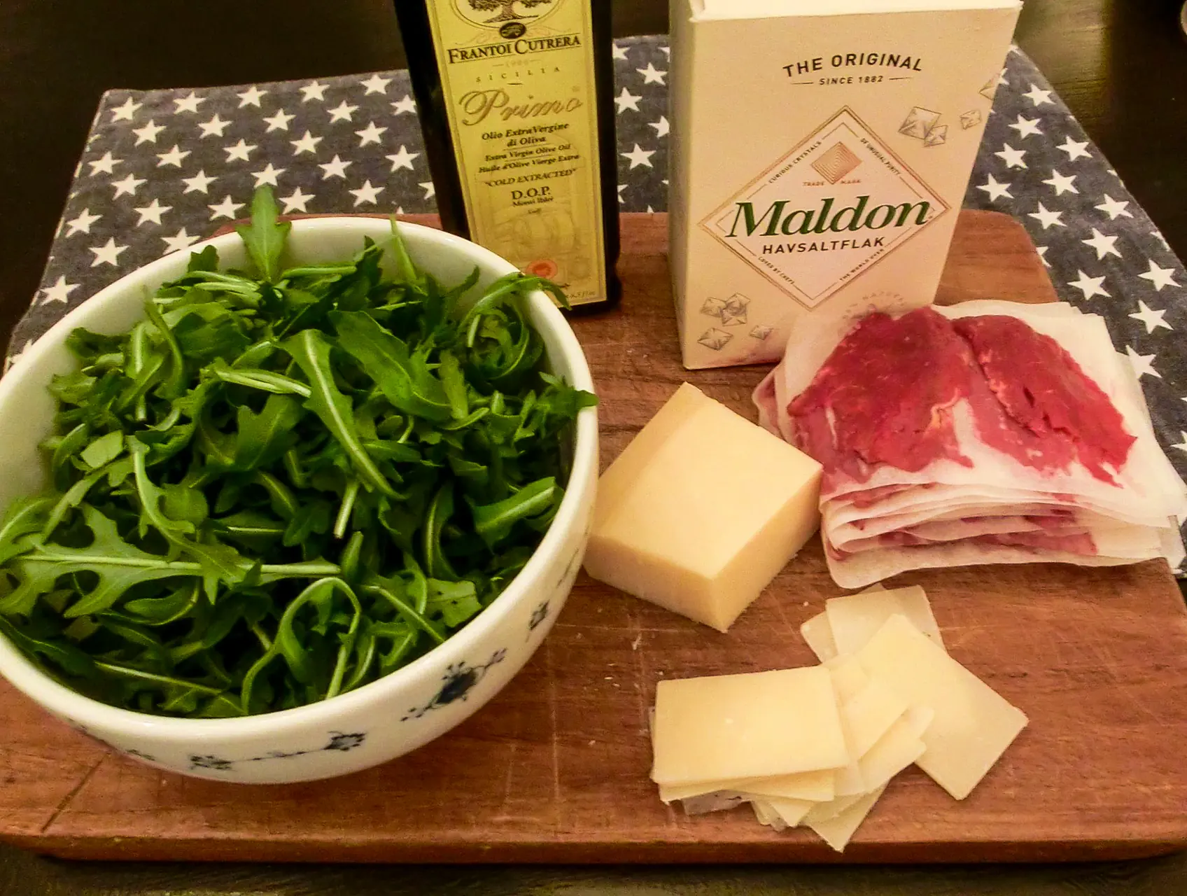 Fordel de tynne skivene på tallerkener. Legg en raus neve ruccolasalat i midten.