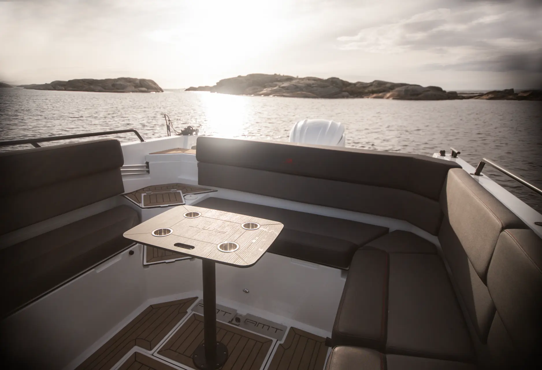 AMT har valgt å ha to separate, behagelige stoler med høy rygg og sidestøtte i kjøreretningen - med integrert demping. Dette er nokså uvanlig i denne klassen, og bidrar til en noe mykere opplevelse i litt sjø. Dashbordet er oversiktlig med enkel adkomst til viktige strømbrytere, baugthruster, trimplan og en 12 tommers kartplotter. Pluss er armlene og bra plassering av gir/gass-hendelen.