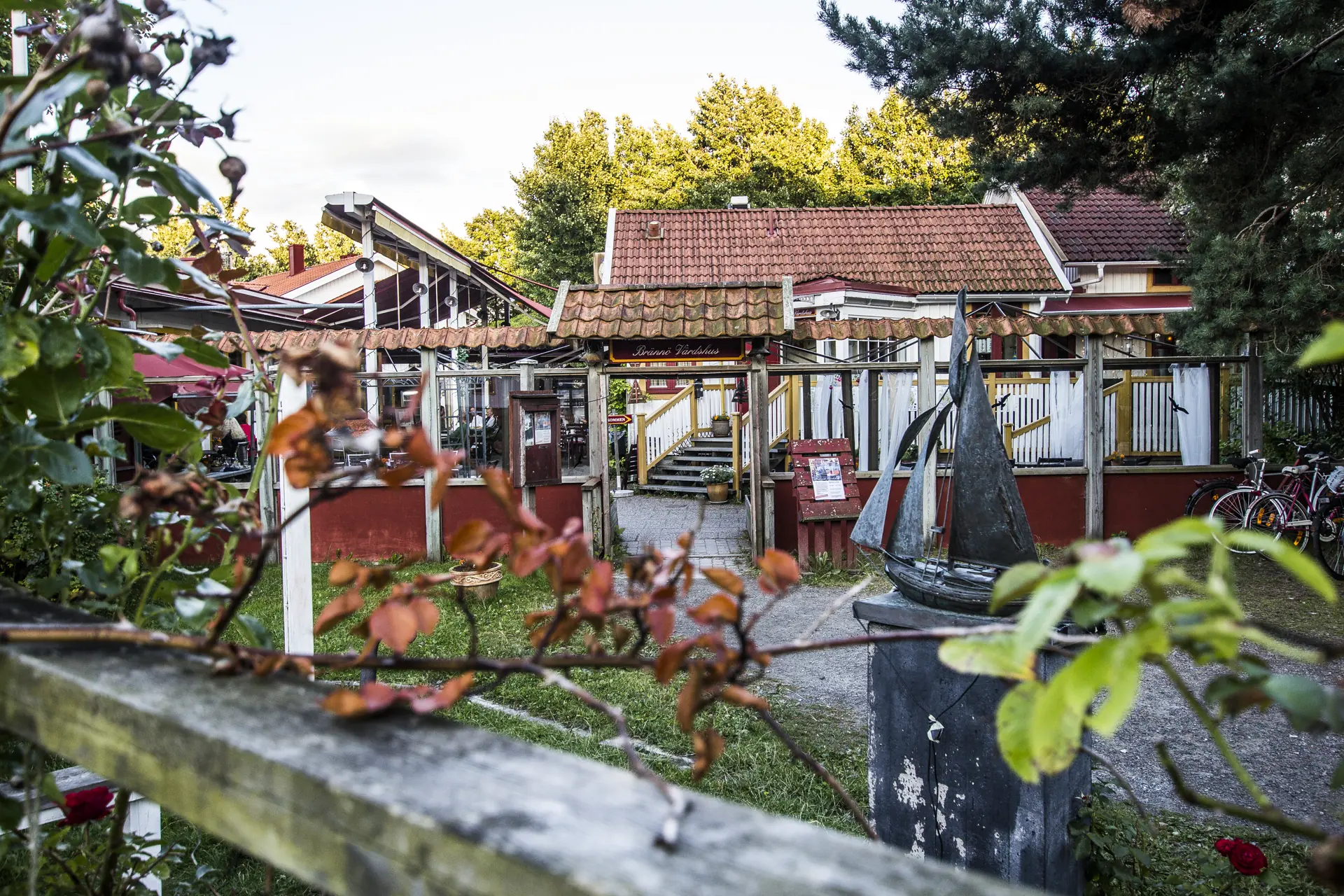 Han ser seg rundt i restauranten som kan ta i mot 150 gjester. En av de drevne servitørene kommer bort med en «Brannöl» og en duggfrisk brennvinsflaske. Ja, også den bærer navnet Brännö. Den lille servicenæringen vet akkurat hvordan de skal ta i mot «nyfikne» Brännö-turister. Og flere enn oss har funnet veien til Värdshuset denne helgen i august. Det yrer av liv her, og maten som serveres er både variert og holder høy standard. Ingen enkle snarveier her, med andre ord. Flere av ingrediensene er lokalt inspirert og sesongavhengig – og hver eneste uke gjennom sommersesongen er det livemusikk her, og en til to ganger i måneden ellers i året.