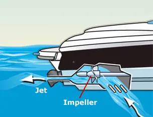 Motoren sitter fortsatt i eget motorrom, men båter med vannjet har verken propell eller ror. Vann blir sugd inn gjennom et bunninntak og blåses ut gjennom dyser i akterspeilet. Båten styres og reverseres ved hjelp av vannstrømmene.