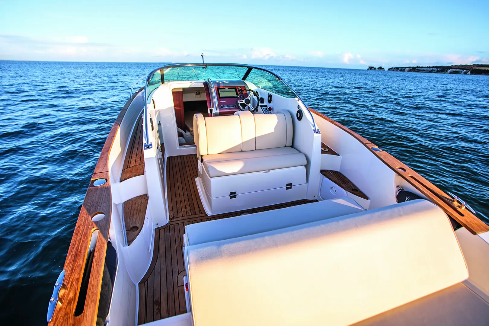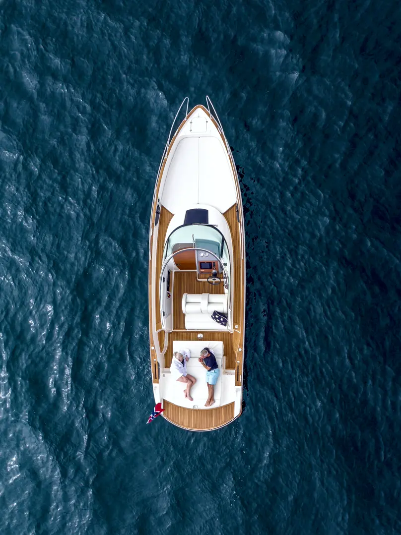 Daycruiseren har en stor, åpen og sosial uteplass. Samtidig kan du felle opp en sprayhood på et par minutter. Båten har også spiseplass for fire-seks personer rundt et bord, og en lett tilgjengelig kjøleboks. En stor badeplattform er integrert i båtens klassiske linjer, og sammen med sofa vendt mot vannspeilet innbyr området til bading og lek.