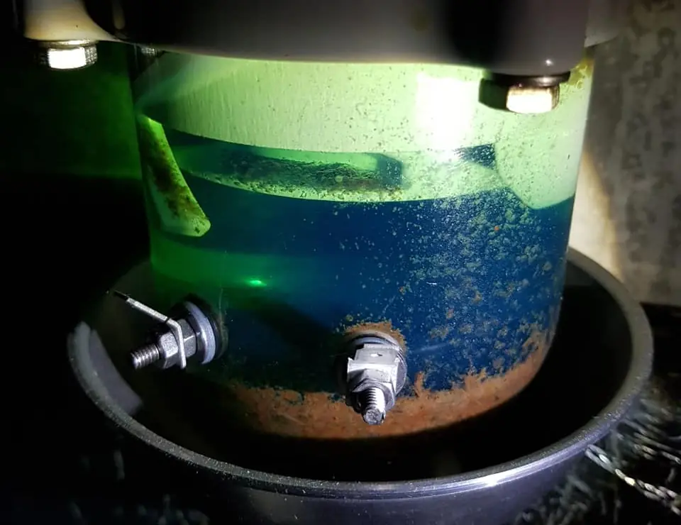 Her ser en tydelig svært kraftig mikrobevekst (dieseldyr) Denne modellen er uten varmeskjold. Her ser en infisert diesel i en vannutskiller med varmeskjold, denne har også sensormulighet for vannalarm (ikke påkoblet her).