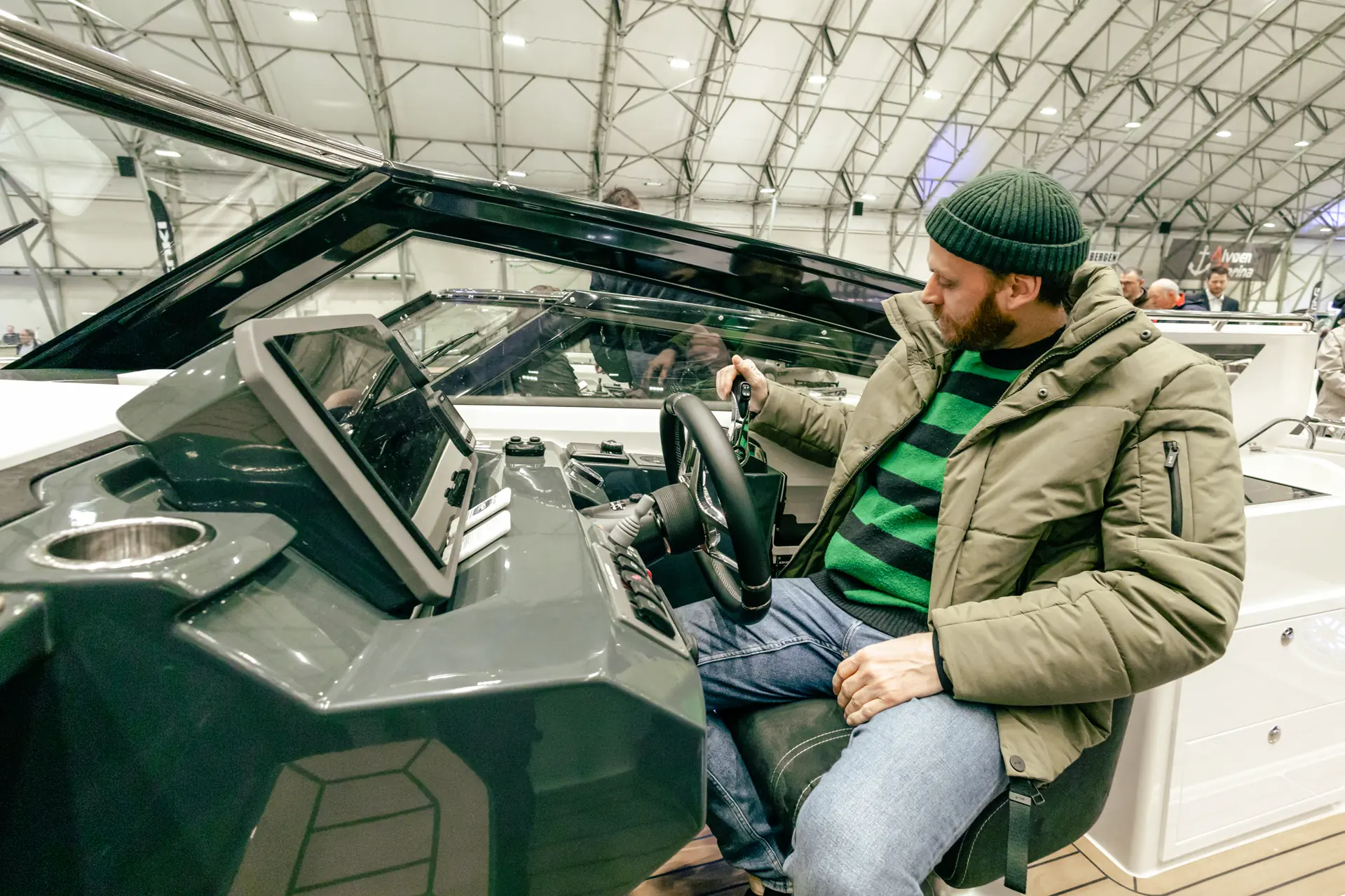 – Planen min er å finne båter her som kan inspirere til bruktfunn på Finn.no, sier Frank. Han kikker videre på de ulike modellene. Kanskje en mindre daycruiser kunne passet likevel? Frank går videre, prøvesitter, vurderer, tar på. Det er mye som frister. Se der, en svær Targa. Så utrolig mange flotte utstillingsbåter.
