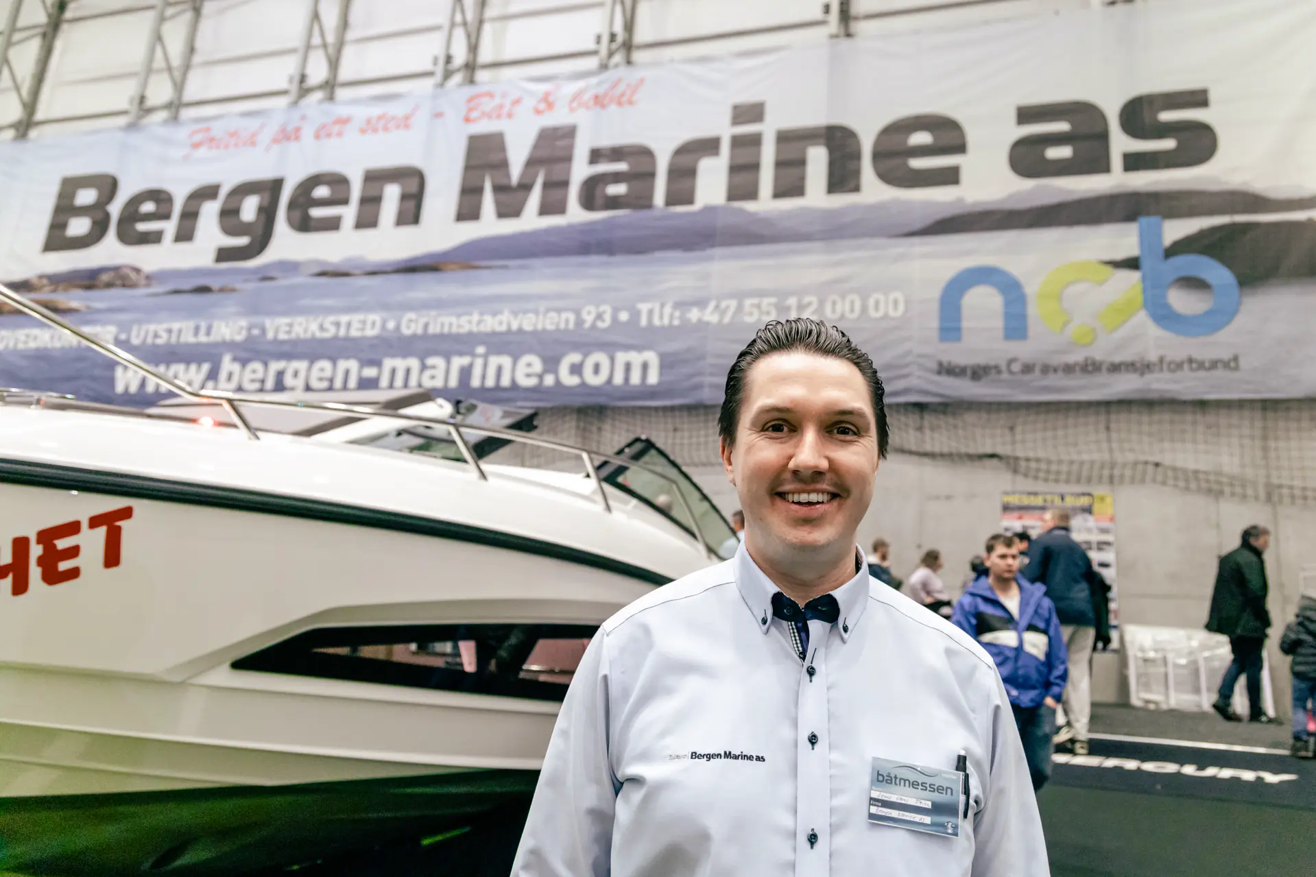Jonas Gams Steine forteller at Bergen Marine er på båtmessen først og fremst for å stille ut alle de flotte produktene sine, og vekke drømmen om båt i folk.