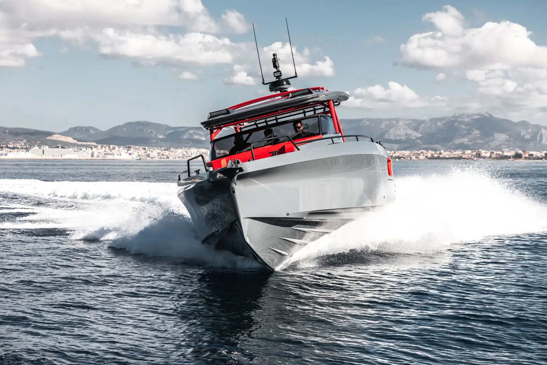 I alle hastigheter har man full manøvrerbarhet. Utrustet med tre X 400 hk Mercury Racing 5.7l V10-motorer, som gir en samlet effekt på 1 200 hestekrefter, er dette virkelig den mest kraftfulle av alle BRABUS Shadows. De oppgir at 45 foteren har en fin «cruisefart» på 40 knop og topphastigheter på 55 knop.