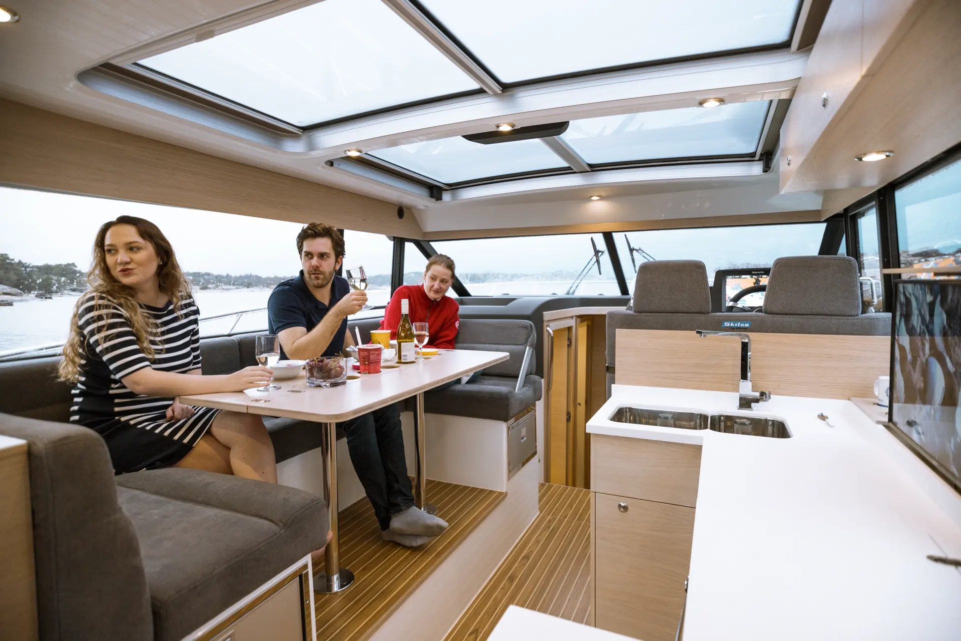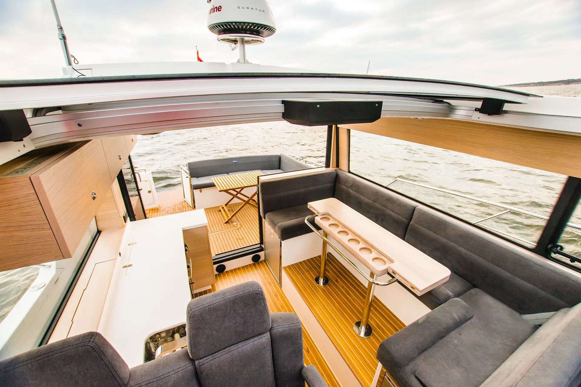 Det nye flaggskipet bærer sitt navn med rette. La oss starte på akterdekket. I samarbeid med vindus- og dørleverandøren Ertec i Tvedestrand kan uteplassen ute- og inneareal åpnes helt. Skyvedøren klappes til side, og vinduet til salongen senkes elektrisk ned. «Kalesjetaket» over akterdekket skyves til side – og det samme gjør store takflater i salongen inne – alt elektrisk ved noen knappetrykk. På luftige dager oppleves dermed den lukkede 39-foteren som en åpen og luftig cruiser.