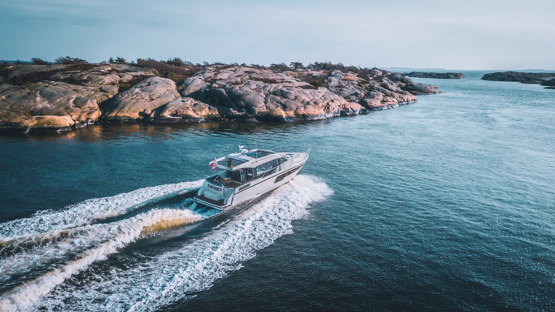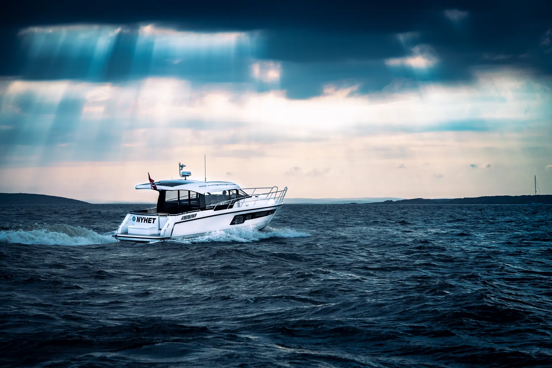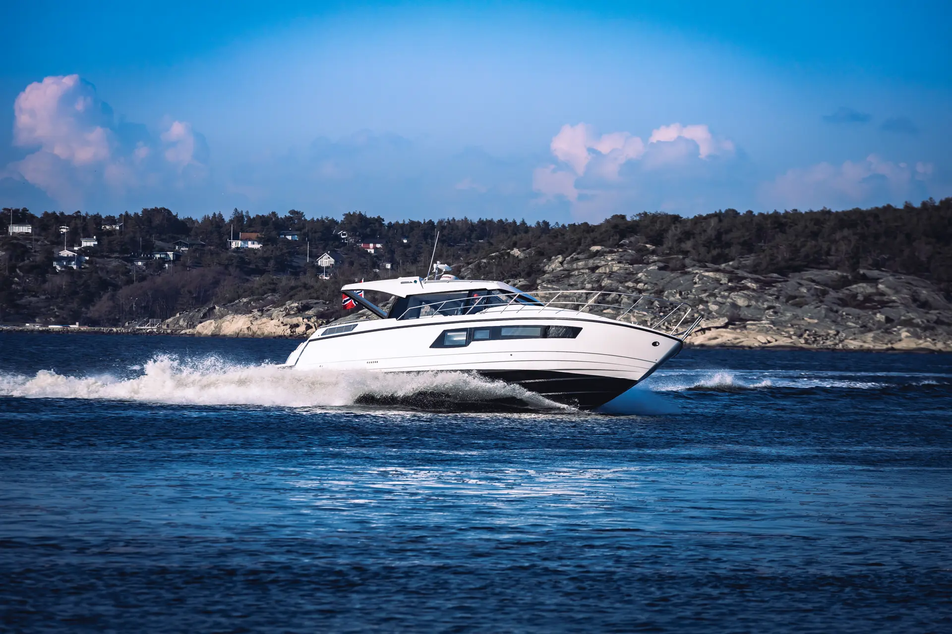 Planingsterskelen ser ut til å være ved rundt 16 knop. Også i lavere hastighet er båten retningsstabil, og oversikten fra førerplass er eksemplarisk. Takket være skyvedør mot nedfelt dollbord og joystickstyring føler vi oss komfortable ved tilegning – kombinert med baugthruster.