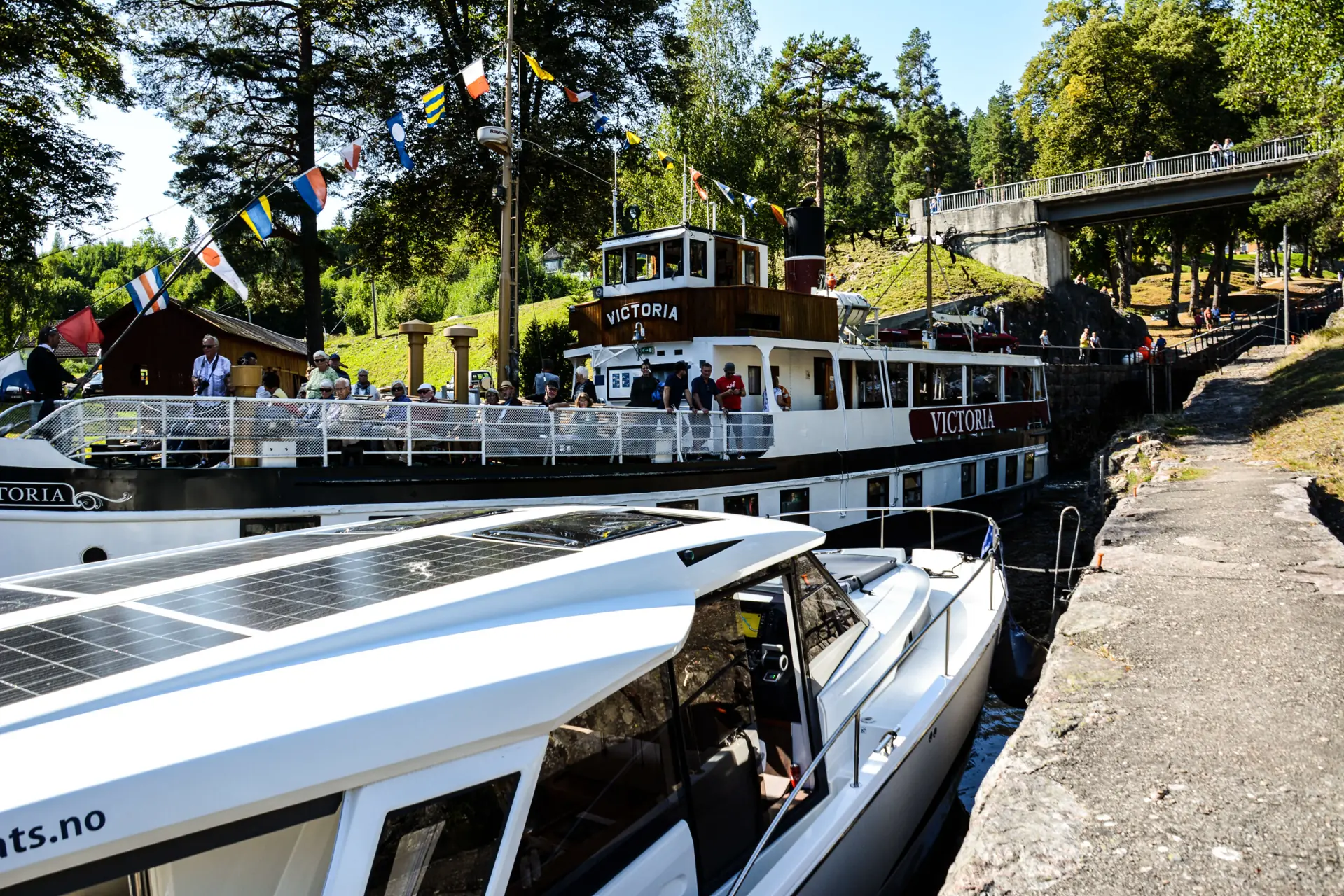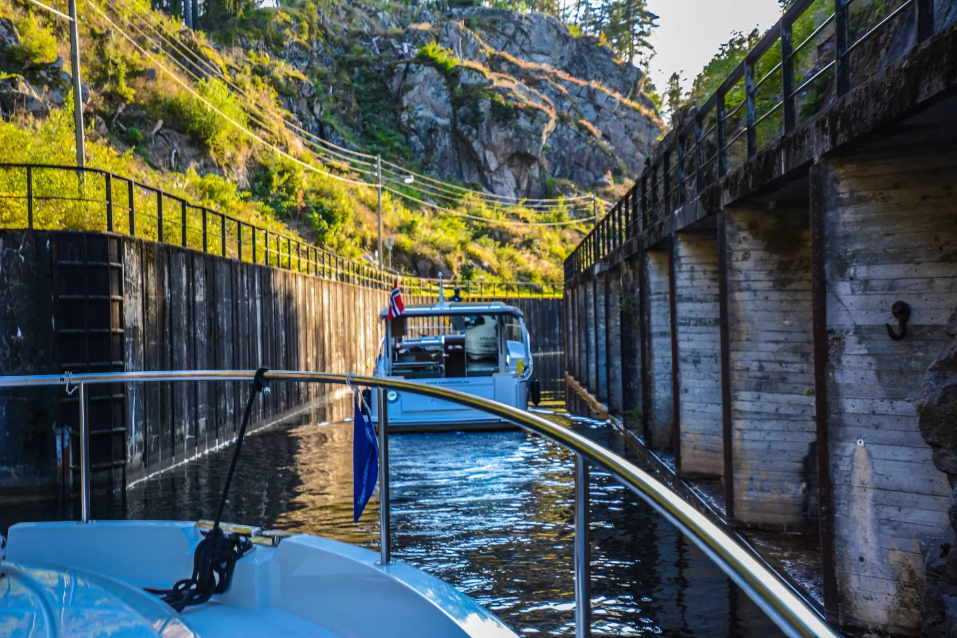 Det er et spesielt syn å se den store, klassiske båten bevege seg ned 23 meter i det naturrike landskapet, og mange skuelystne har møtt opp for å få med seg begivenheten. I det siste sluseport åpner seg får vi oppleve vannstrømmenes kraft der vi ligger fortøyd på siden av kanalen – så husk å fortøye med gode spring og lange fortøyninger hvis du må vente ved slusene.