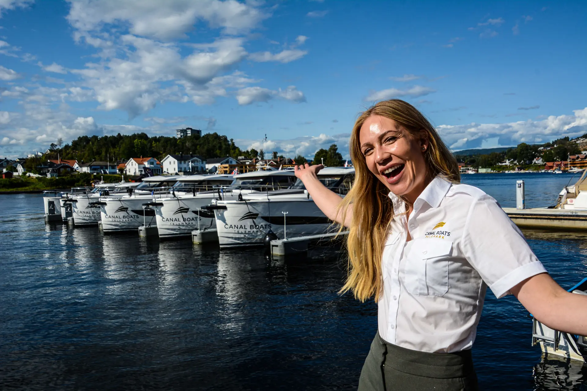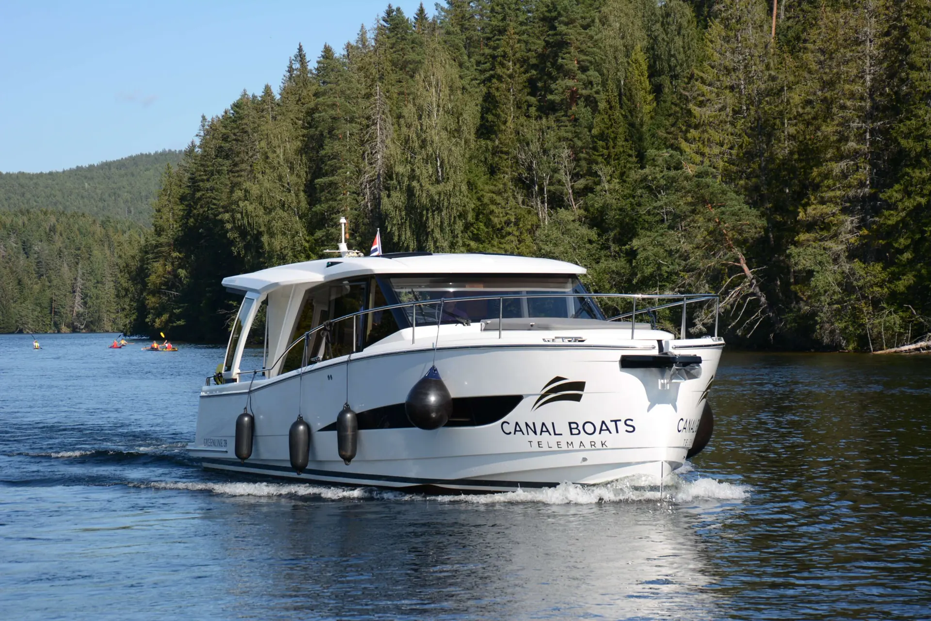 Telemarkskanalen strekker seg fra Skien til Dalen, en seilas på 105 km som løfter båten 72 meter opp. Den første slusa ligger i Skien sentrum, mens vår tur starter fra Porsgrunn Gjestehavn, cirka fire nautiske mil unna. Her har Nora Sjögren-Johre og Ernst Terje Jakobsen sin første sesong i 2021 med utleie av båter fra Greenline med elektrisk motor. Canal Boats Telemark har satset knalltøft med fire 39-fotere og to 33-fotere som leies ut, og vi skal på tur med Greenline 39 E-drive. Båten har to doble lugarer, bad med dusjrom, en stor salong med åpen bysseløsning ut mot akterdekket og en badeplattform som felles ned. Båten leveres både med diesel, elektrisk eller hybrid fremdrift, og Canal Boats er første norske kunde som velger elektrisk. Til gjengjeld får du bort lukten av eksos, vibrasjoner og motorstøy.