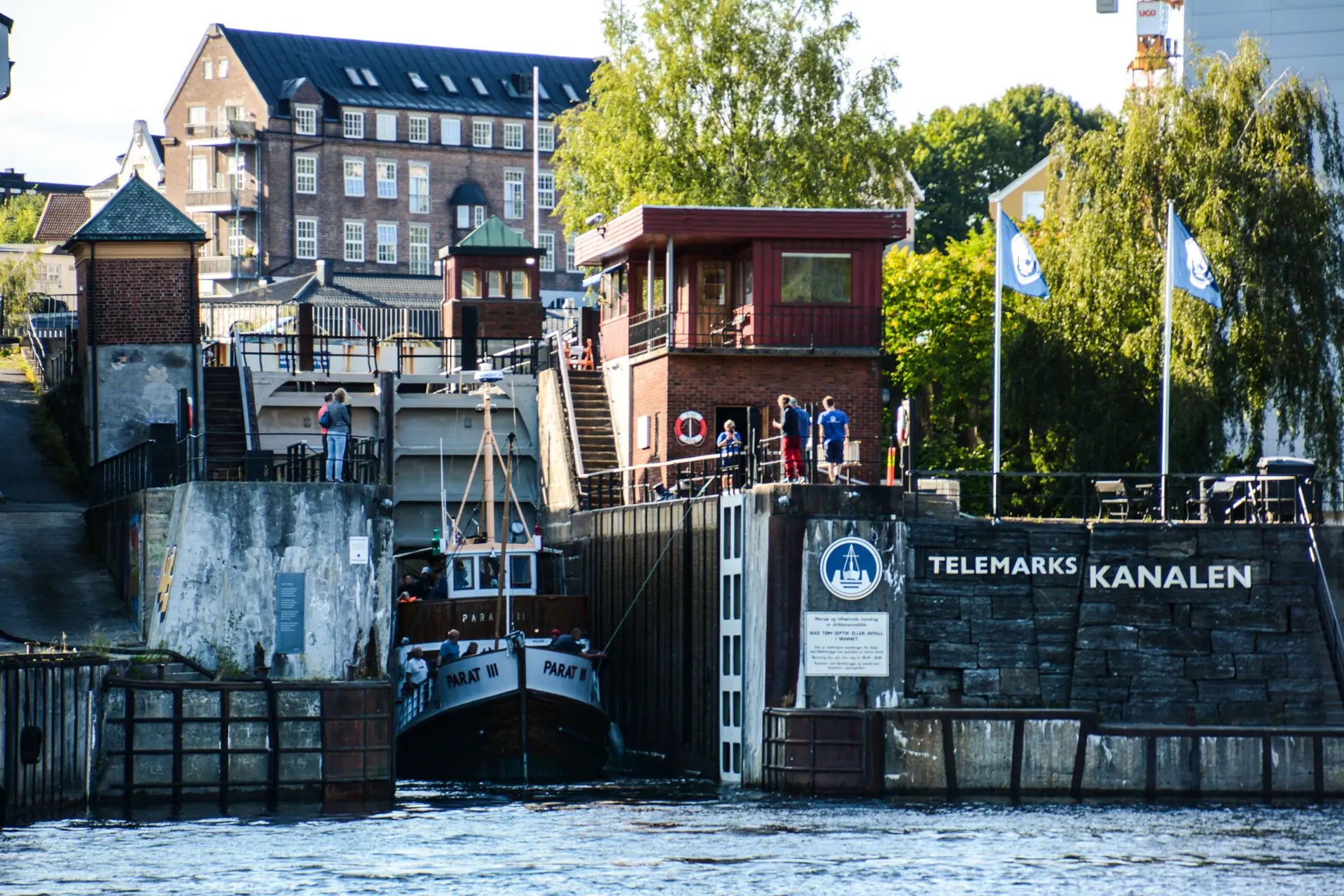 Dag to begir vi oss ut på det mange mener er de mest spektakulære slusene i kanalen. En av de serviceinnstilte slusevokterne gir oss en innføring i slusing og viser oss hvordan vi bør låse tauet med kryssholtene og stramme inn tauet. I tillegg får vi to store kulefendere om bord, som vi virkelig får bruk for i de gamle slusene med vegger av naturstein. Overgangen fra de to første slusene til Ulefoss sluser blir stor. På broa og langs slusene står folk og tar del i at det drevne slusemannskapet kaster tau til oss og åpner og lukker portene med ren håndkraft, akkurat som for 130 år siden. Med riktige teknikker går det hele smertefritt, men skipper og mannskap må være oppmerksomme og følge med. Det er heller ikke dumt å bruke hansker, fikk vi erfare. Det er krefter i sving når portene åpnes og du får følelsen av en foss som strømmer mot båten. Telemarkskanalen kan ta båter med maks lengde på 31,4 meter, 6,6 meters bredde, kjøldybde på 2,5 meter.