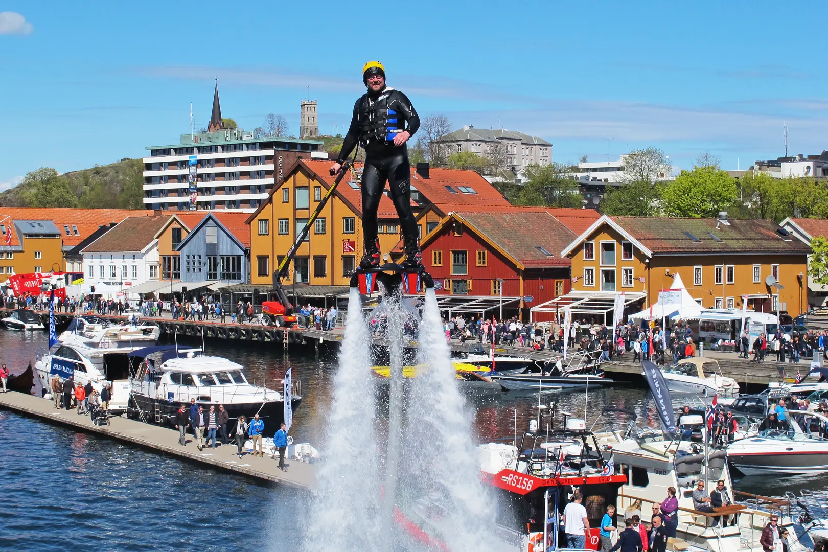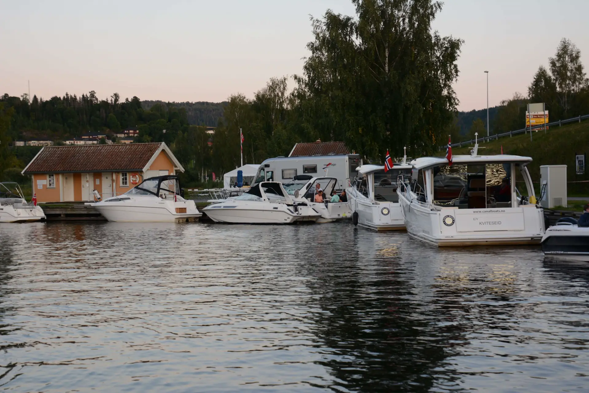 Neste dag skal vi ta en avstikker som for mange kanskje er litt utenom den typiske ruta langs kanalen, men som så absolutt er vel verdt et besøk. Etter å ha sluset oss ned til Ulefoss og kommet ut på Norsjø, skal vi seile 7,3 nautiske mil nord-vest i retning kjente steder som Norsjø Ferieland og Notodden. Destinasjonen er «fruktbygda» Gvarv, og innseilingen fra Norsjø er om ikke enda trangere og mer utfordrende enn det vi har opplevd på turen så langt. Gvarv Båtforening har riktignok sørget for å merke leden og fått mudret for båter som stikker 0,8-1 meter dypt, og det er videre planer om å mudre og tilrettelegge ytterligere, får vi opplyst av båtforeningens leder, Leif Rune Espeseth. Han kommer oss i møte med en lettbåt og loser oss inn til bryggeanlegget, som per dags dato akkurat får plass til våre to 39-fotere.