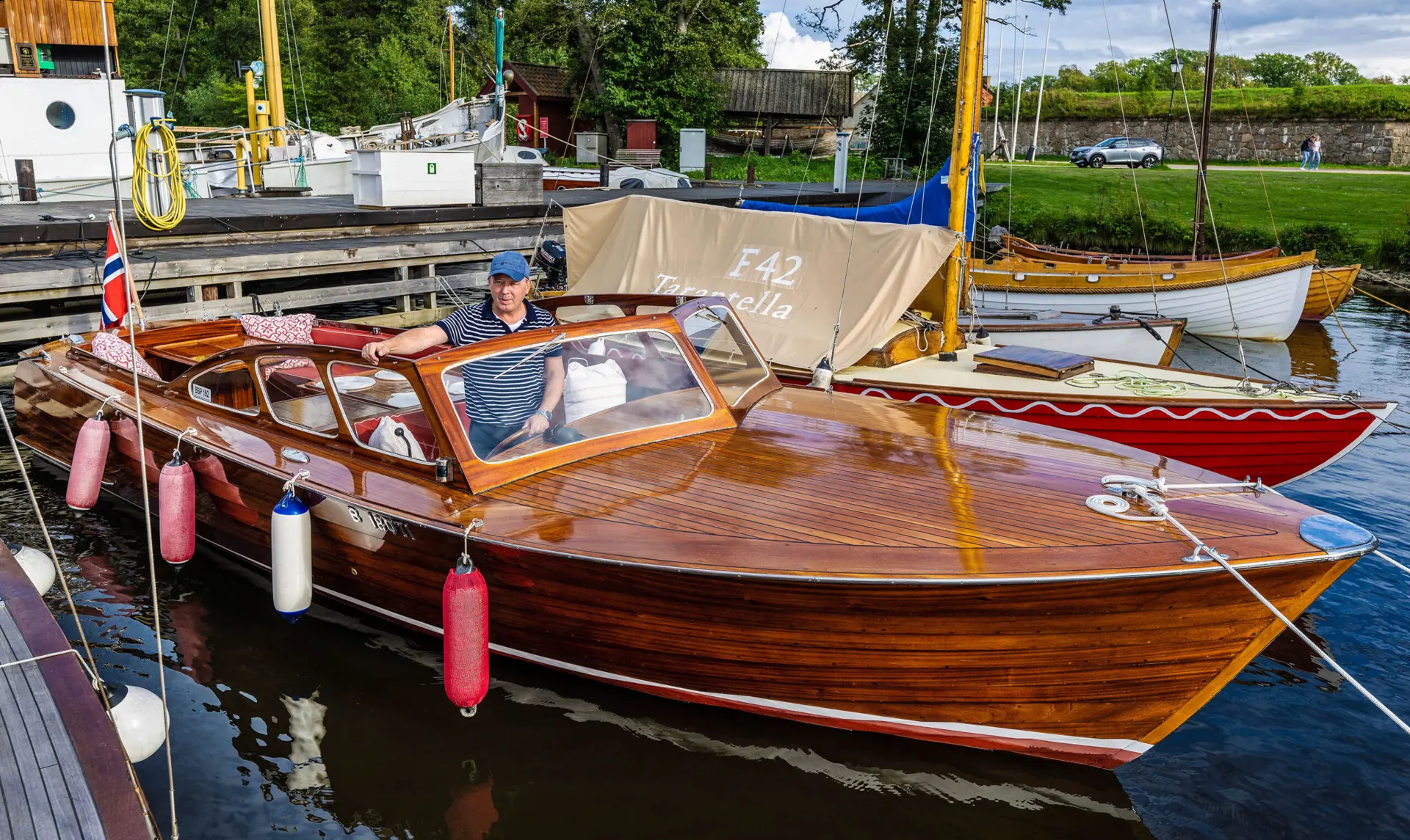 – Ja, det er sant. Dette er drømmebåten og jeg har sett den i mange år liggende ved en brygge i Fredrikstad. Båten har vært brukt mye opp gjennom årene og har blant annet vært flere ganger med kunder i Oslo. I forhold til en Aasterne, Skilsø eller en Furuholmen så er denne båttypen mye bredere, forteller Knut som nesten er ustoppelig i å fortelle om båtens historie. Ja, et skrog med denne finishen må ligge trygt i hjemmehavna. For å unngå unødvendig riper/merker i mahogniskroget har derfor kona Line strikket strømper til fenderne i matchende farge. Ingenting er overlatt til tilfeldighetene. En klassiker av et maritimt møbel, må selvsagt skånes for unødvendig påvirkning fra vår tids tjas og mas...