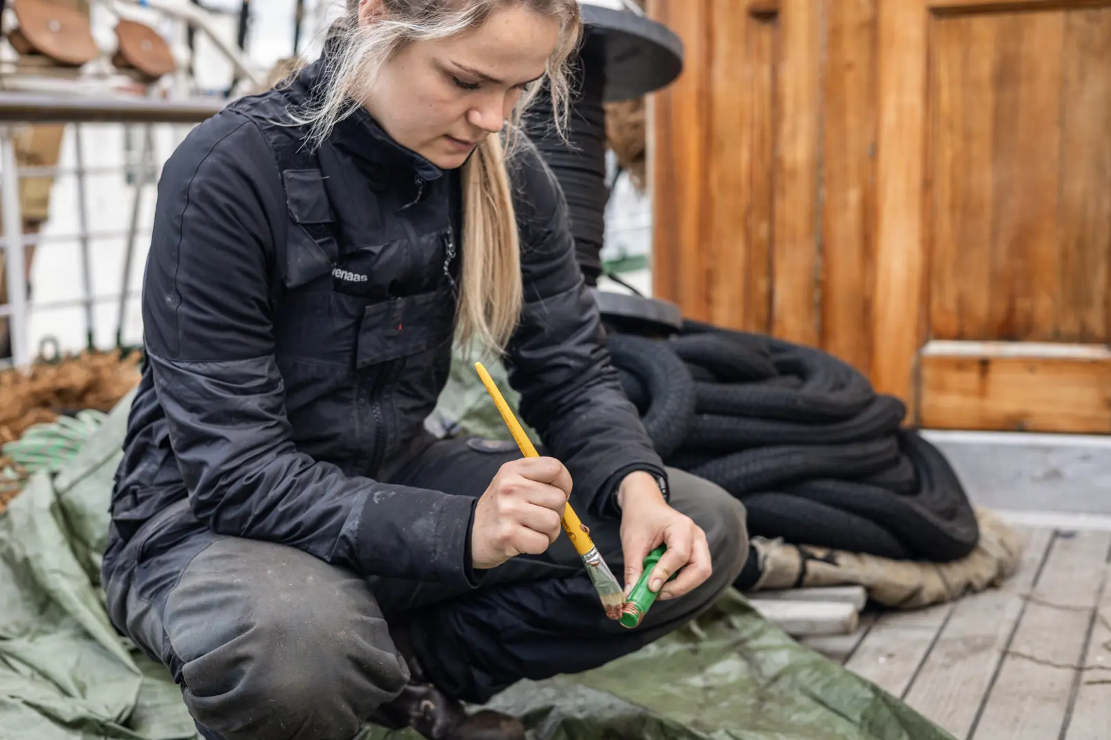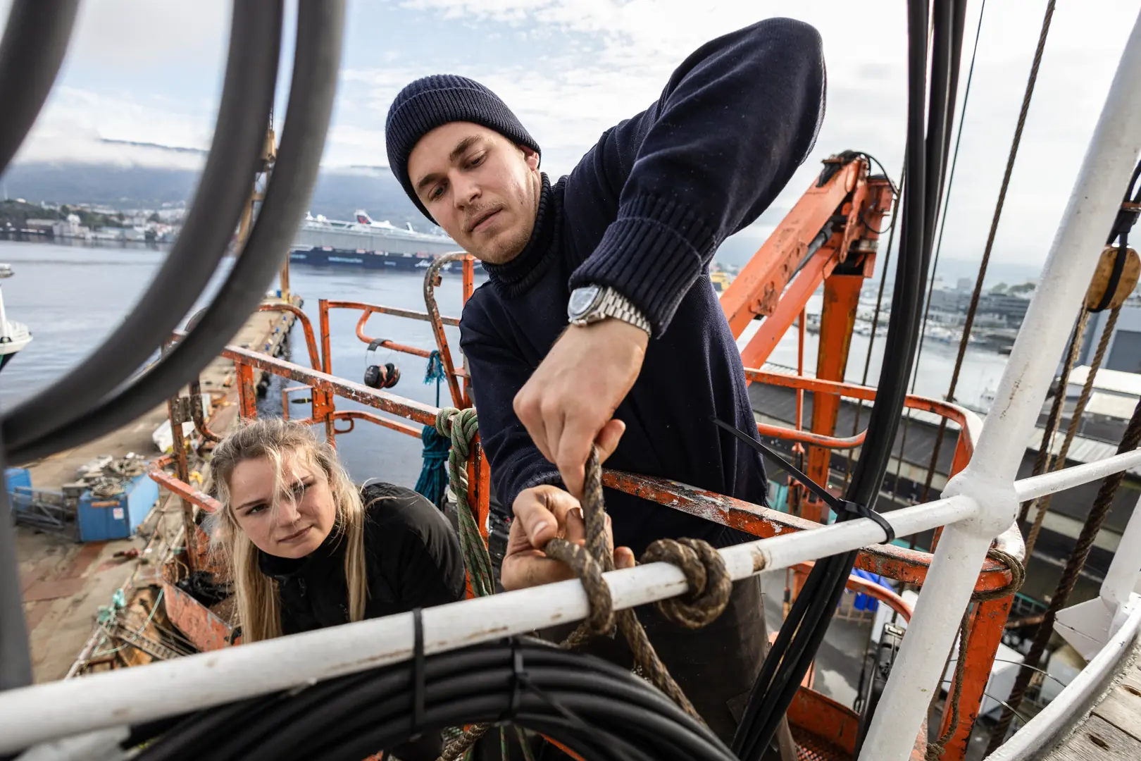 Hun kikker seg rundt på skipet. Omkring jobber fagfolk fra ulike maritime miljøer, matroskolleger og tømmermenn. Det er ingen med slips og dress å se i mils omkrets, men skitne hender og ullgensere.