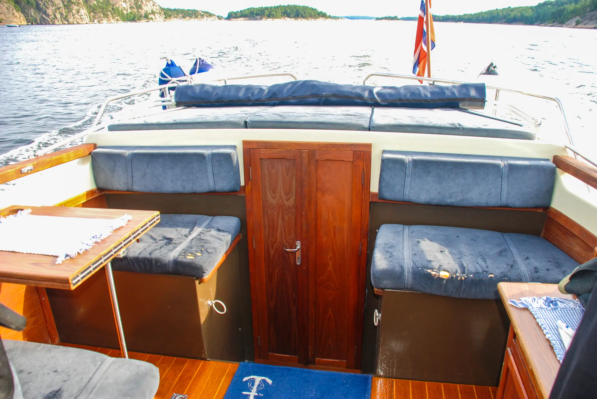 Sklisikringen på dekket og dollbordet var bra da båten var ny, mens det etter mange års slitasje ikke lenger har samme effekt – og er en av de oppgavene en ny eier bør gjøre noe med etter hvert. Ellers er badeplattformen, som er laget av rør med teakribber, plassert så høyt over vannet at man ikke blir våt på beina når man for eksempel skal ta opp ankeret. Badeleideren har tilstrekkelig lengde og kan utløses av en person som ligger i vannet.