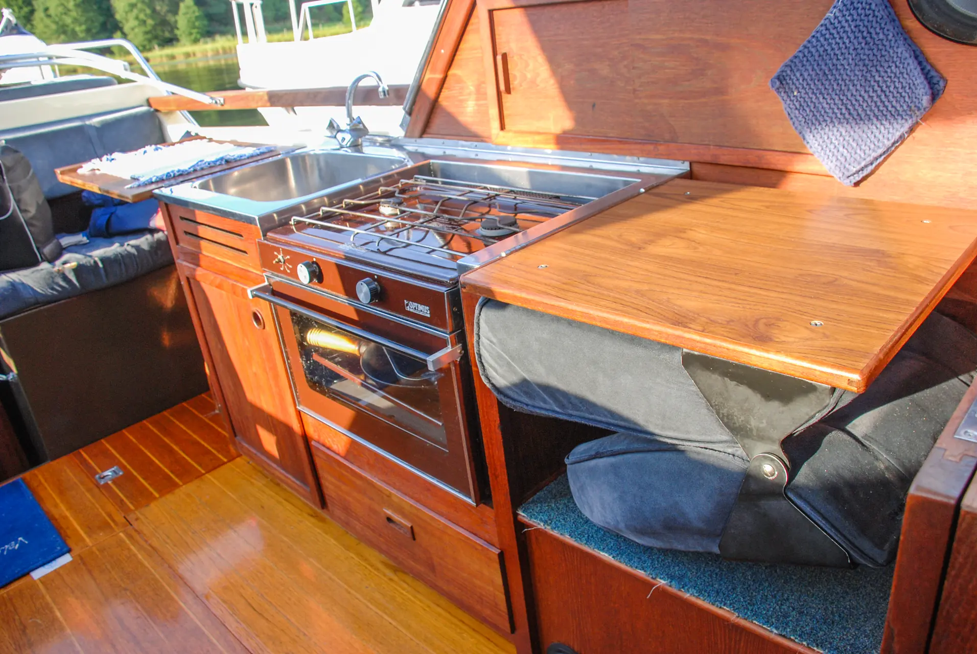 Kokeapparatet står i en rustfri «kasse» som henger sammen med en stor oppvaskkum. Renhold av byssa byr ikke på problemer. Varmtvann var ikke standardutstyr den gang båten ble levert, men det er nok også i stor grad innlagt i de fleste båtene etter hvert.