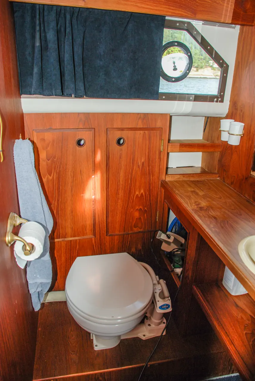 Toalettet ombord i Skarpnes 30 er rommelig og skikkelig utstyrt. Her er det montert et marinetoalett som tåler å bli brukt. Septiktanken er plassert under en av benkene i salongen. Her finner man også pumpen som skal til for å tømme tanken. Høyden mellom dekk og dørk er 180 cm, og det er tilstrekkelig. Skottene er i teak, og på dørken ligger det et løst teppe. Det mangler imidlertid en terskel ut mot salongen, og skottet mot salongen er ikke tett i «vindushøyde». Ventilasjonen, en liten stengbar ventil, er heller ikke så god at vond lukt forsvinner fort.