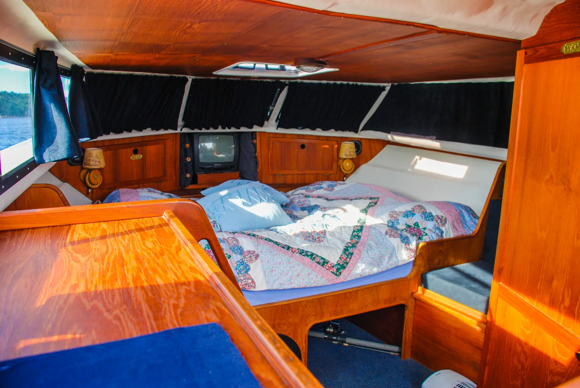 Akterkabinen er en ren soveplass, men kan selvfølgelig fungere som «barnerom» for de aller yngste besetningsmedlemmene. Høyden mellom dekk og dørk er ikke mer enn 1,3 meter, og stuveplassen er også her nokså begrenset. Ved hjelp av platen som brukes i akterbenken i cockpiten, kan man gjøre om hele rommet til en stor køye som måler 1,1 x 2,1 meter. I tillegg har man en køye langskips som er ca. 1,6 meter lang. I akterkabinen er det plass til to voksne og ett eller to små barn.